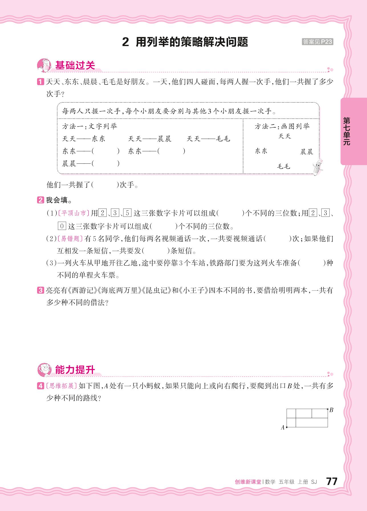 2024秋上册五年级数学苏教版 第七单元 解决问题的策略——2. 用列举的策略解决问题