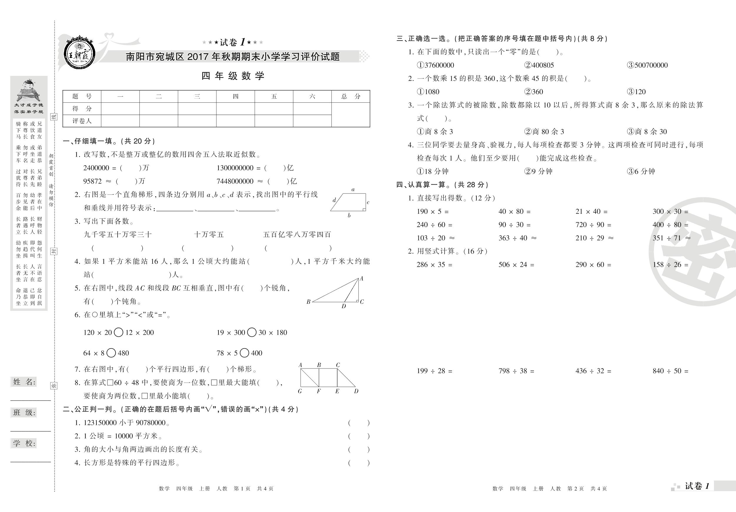 2017-2018学年第一学期南阳市宛城区四年级数学试卷(人教版)【1】