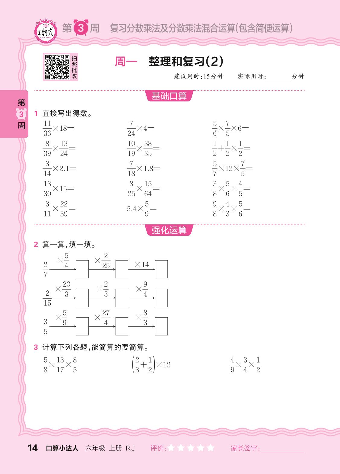 2024秋上册六年级数学人教版 口算计算专练 第3周