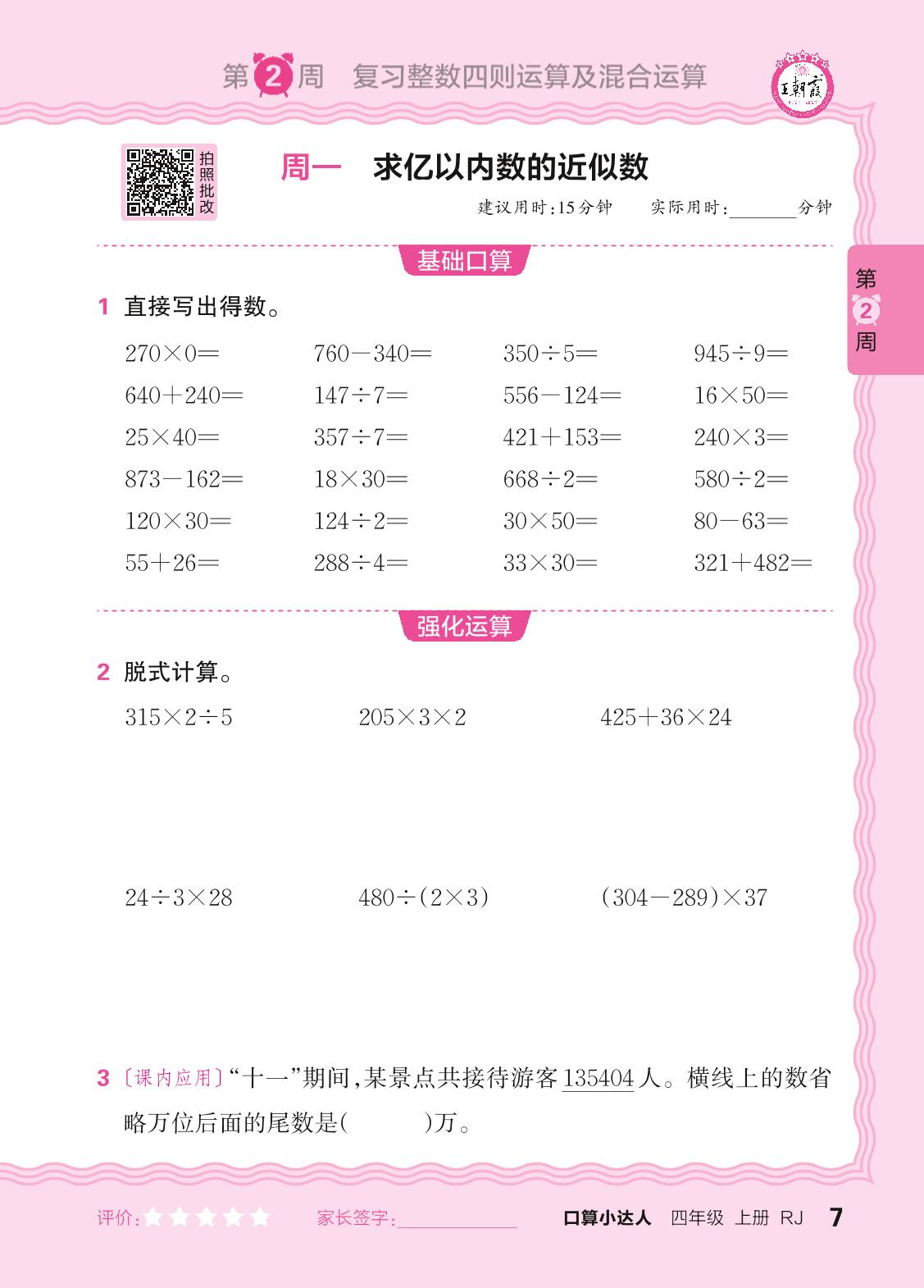 2024秋上册四年级数学人教版 口算计算专练 第2周