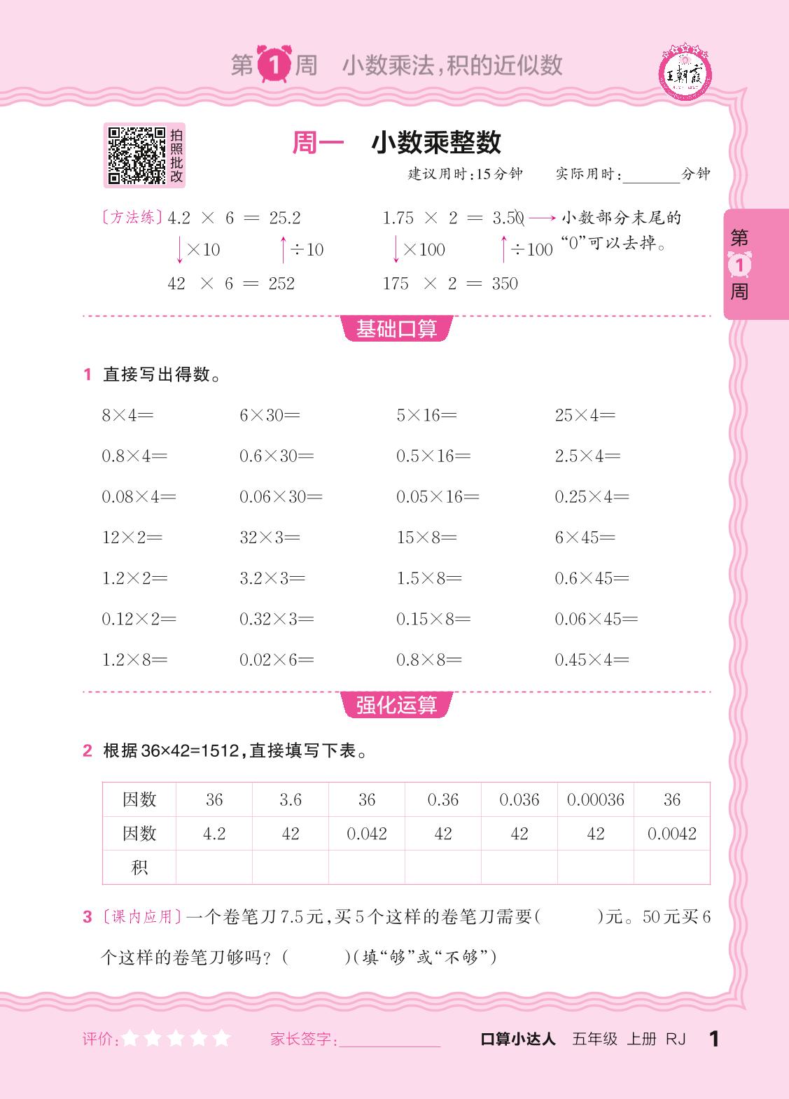 2024秋上册五年级数学人教版 口算计算专练 第1周