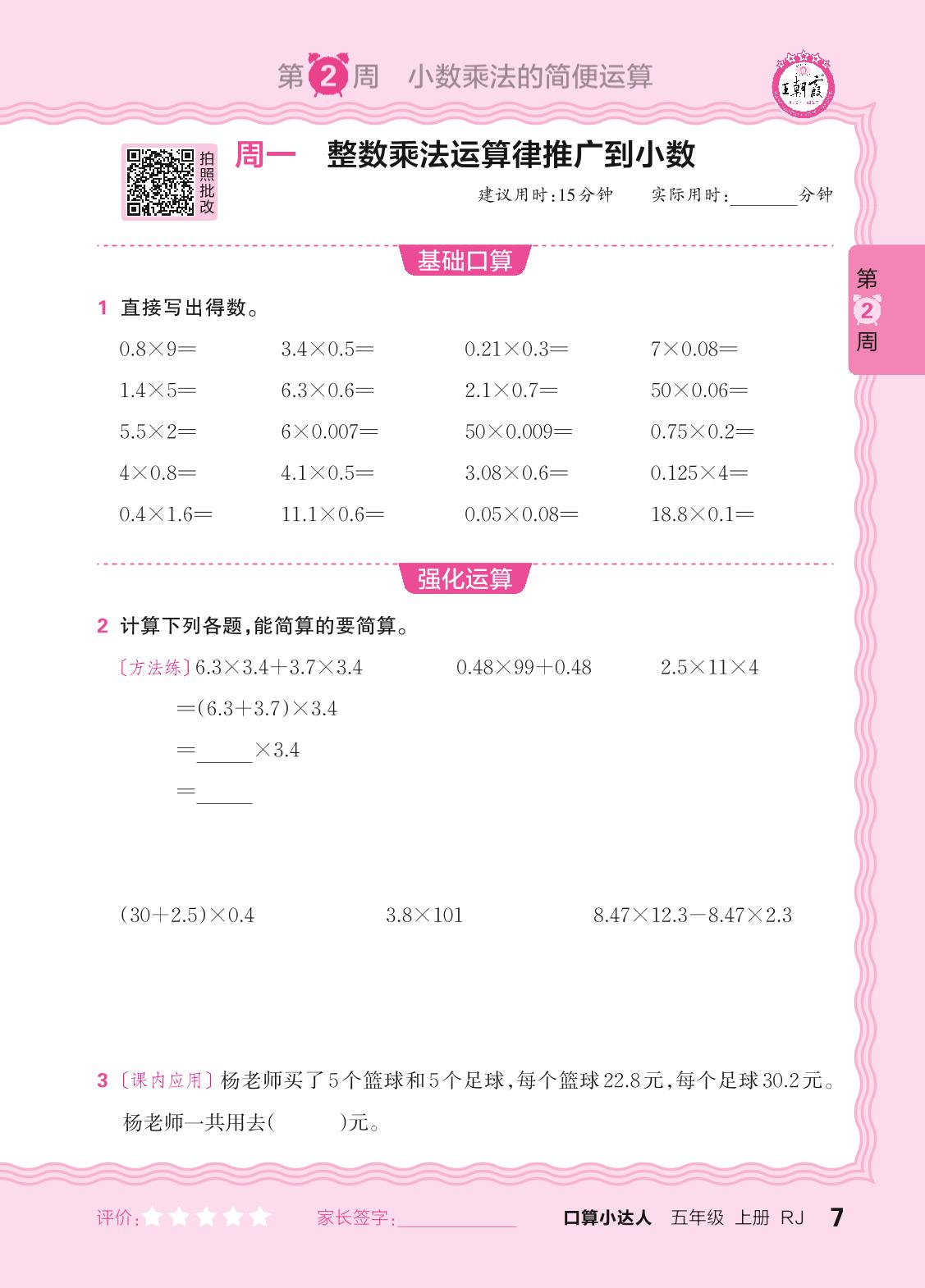 2024秋上册五年级数学人教版 口算计算专练 第2周