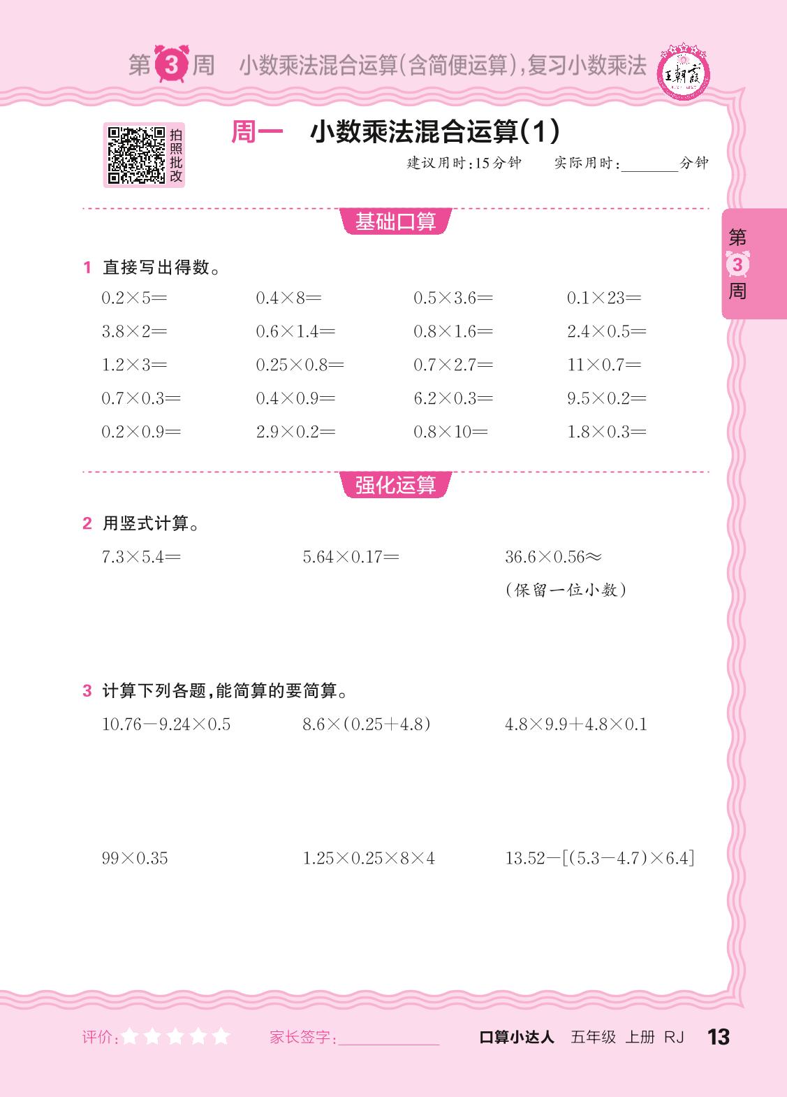 2024秋上册五年级数学人教版 口算计算专练 第3周