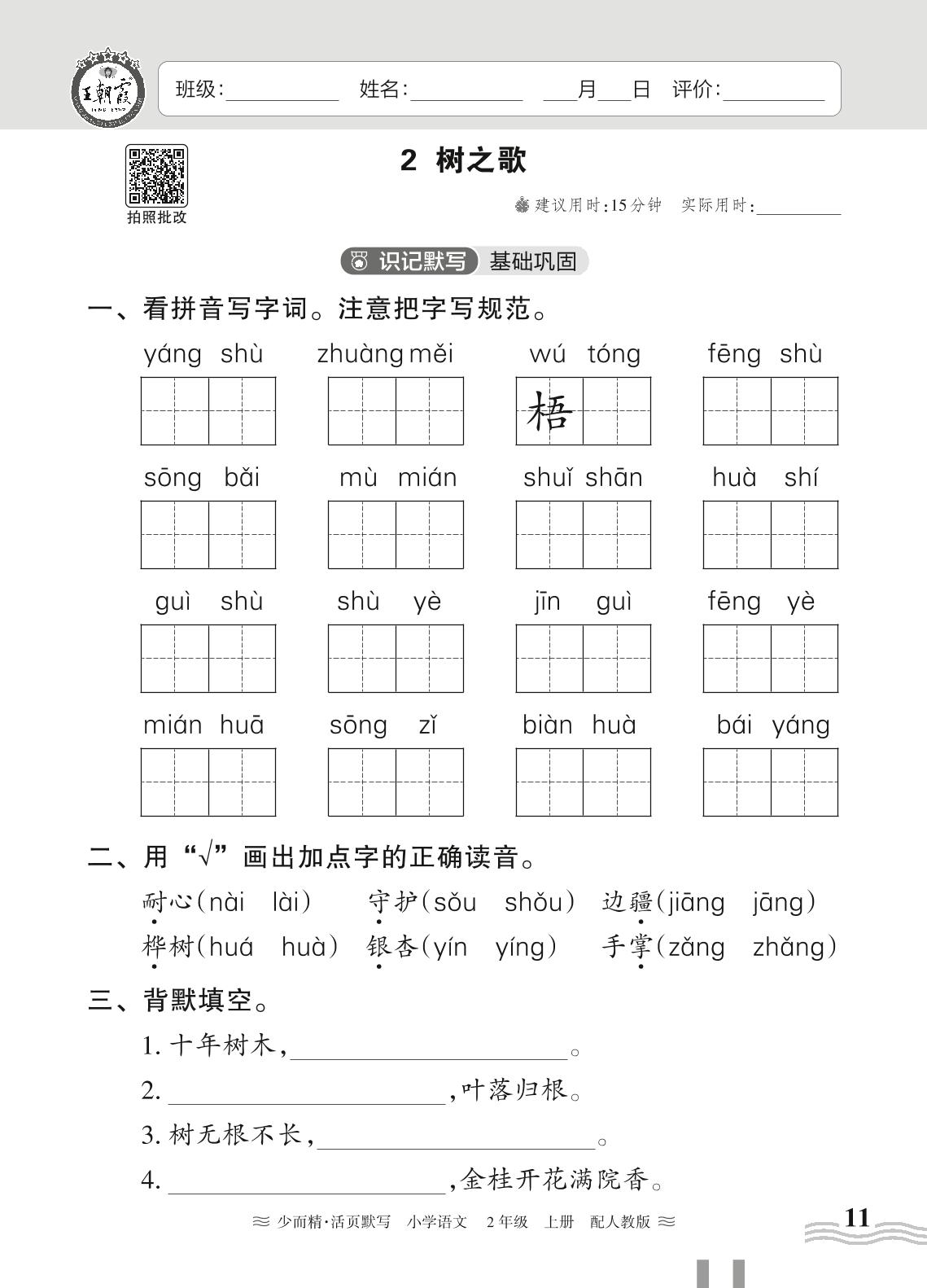 2024秋上册二年级语文人教版 第二单元——2. 树之歌