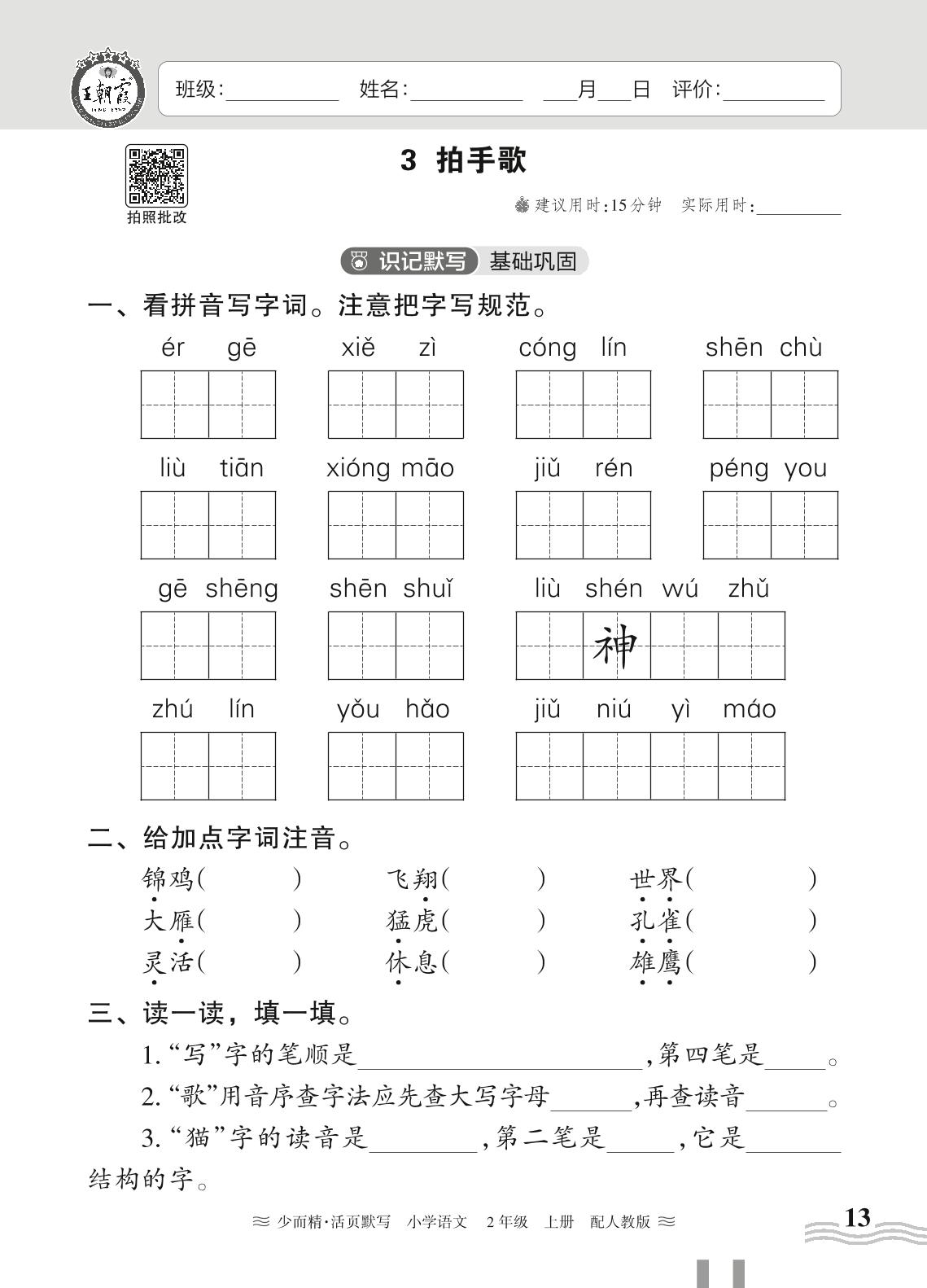 2024秋上册二年级语文人教版 第二单元——3. 拍手歌