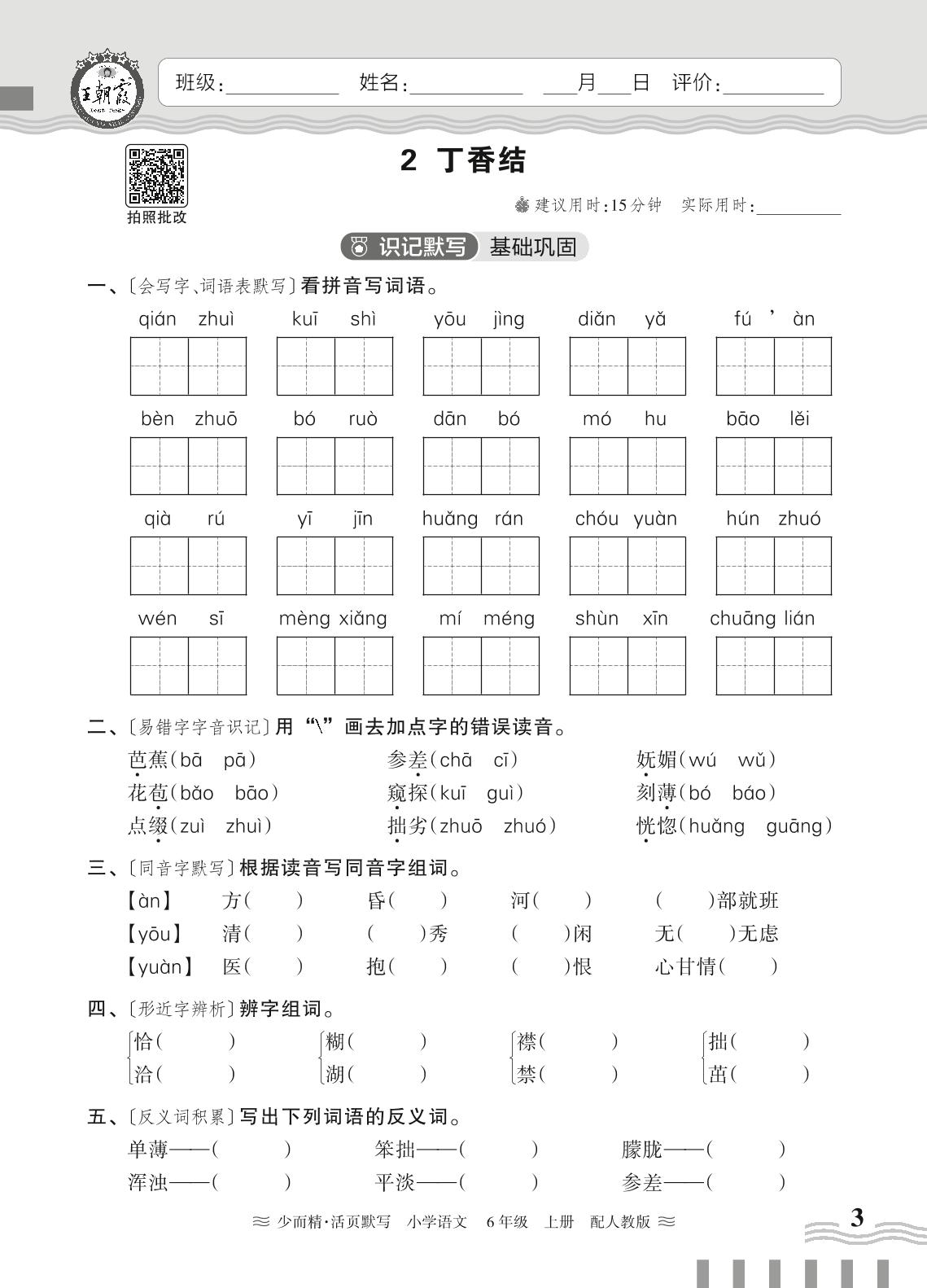 2024秋上册六年级语文人教版 第一单元——2. 丁香结