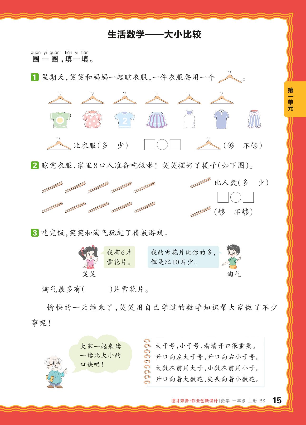 2024秋上册一年级数学北师版 第一单元 生活中的数——生活数学 大小比较