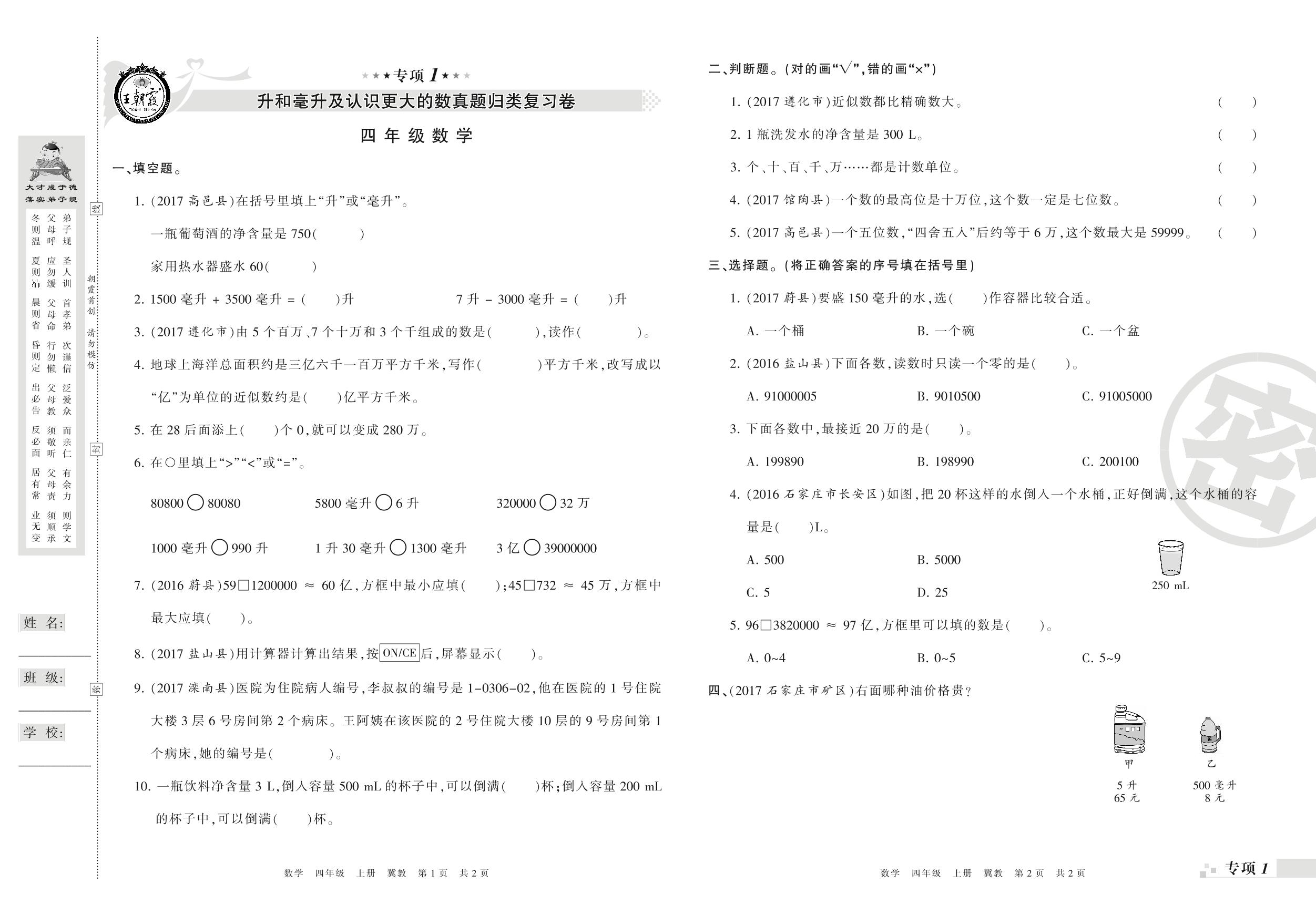 王朝霞期末专项卷——升和毫升及认识更大的数、三位数除以两位数(一)真题归类复习卷四年级上册数学(冀教版)_R210804155506【0】