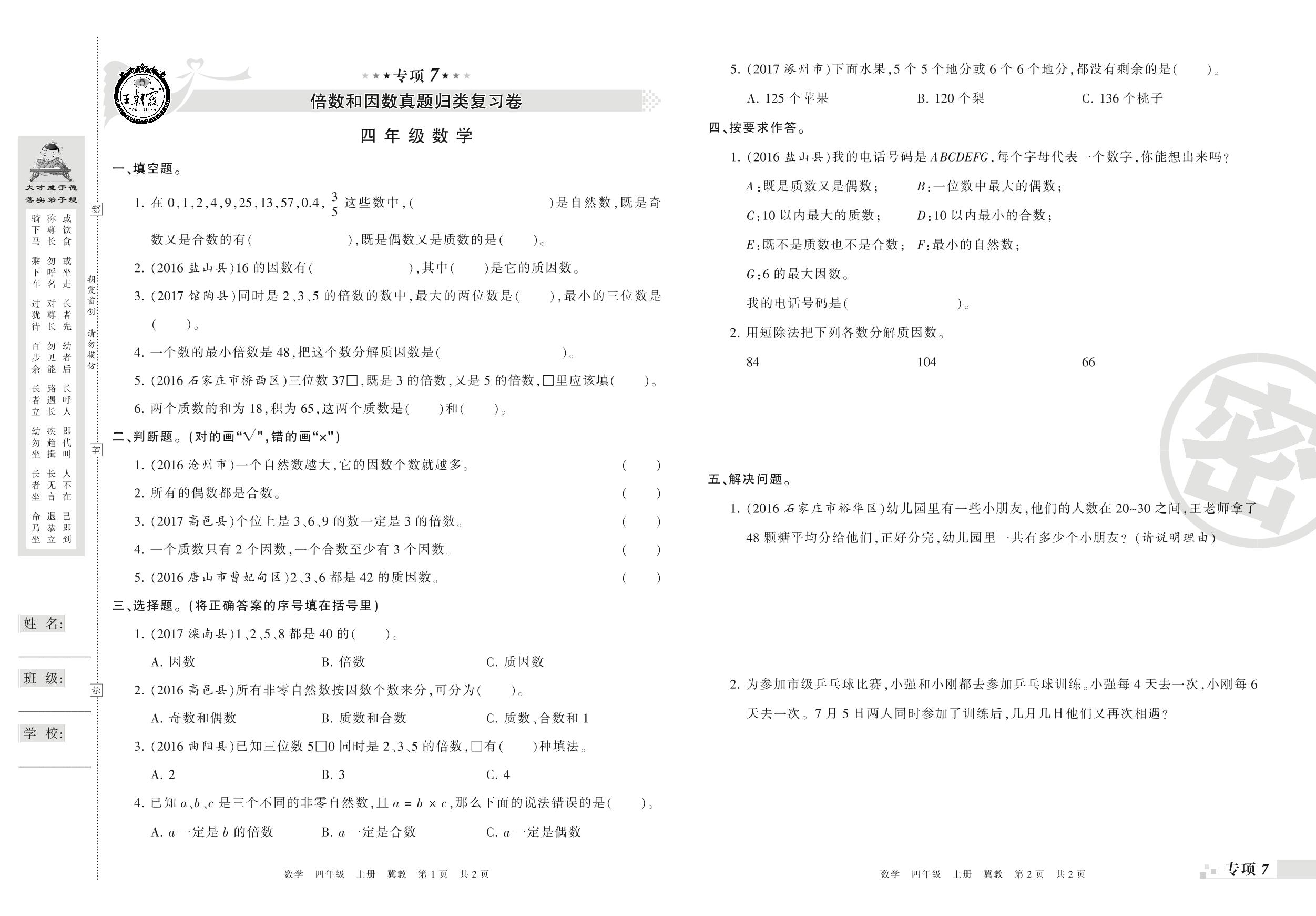 王朝霞期末专项卷——倍数和因数、平均数和条形统计图真题归类复习卷四年级上册数学(冀教版)_R210804155519【0】