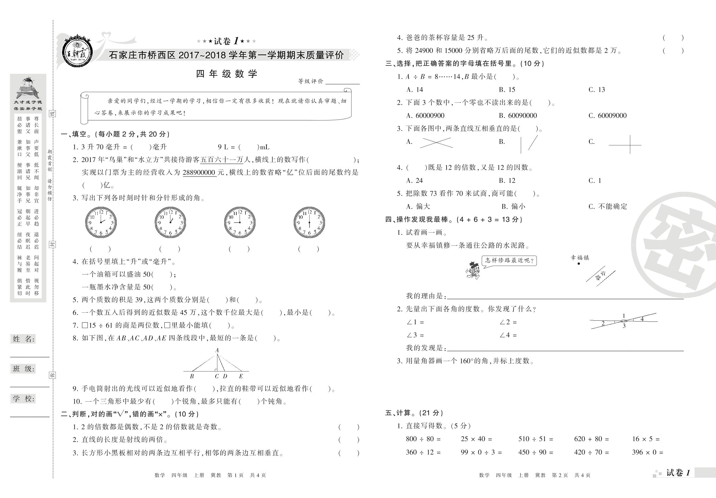 2017-2018学年第一学期石家庄市桥西区四年级数学试卷(冀教版)【1】