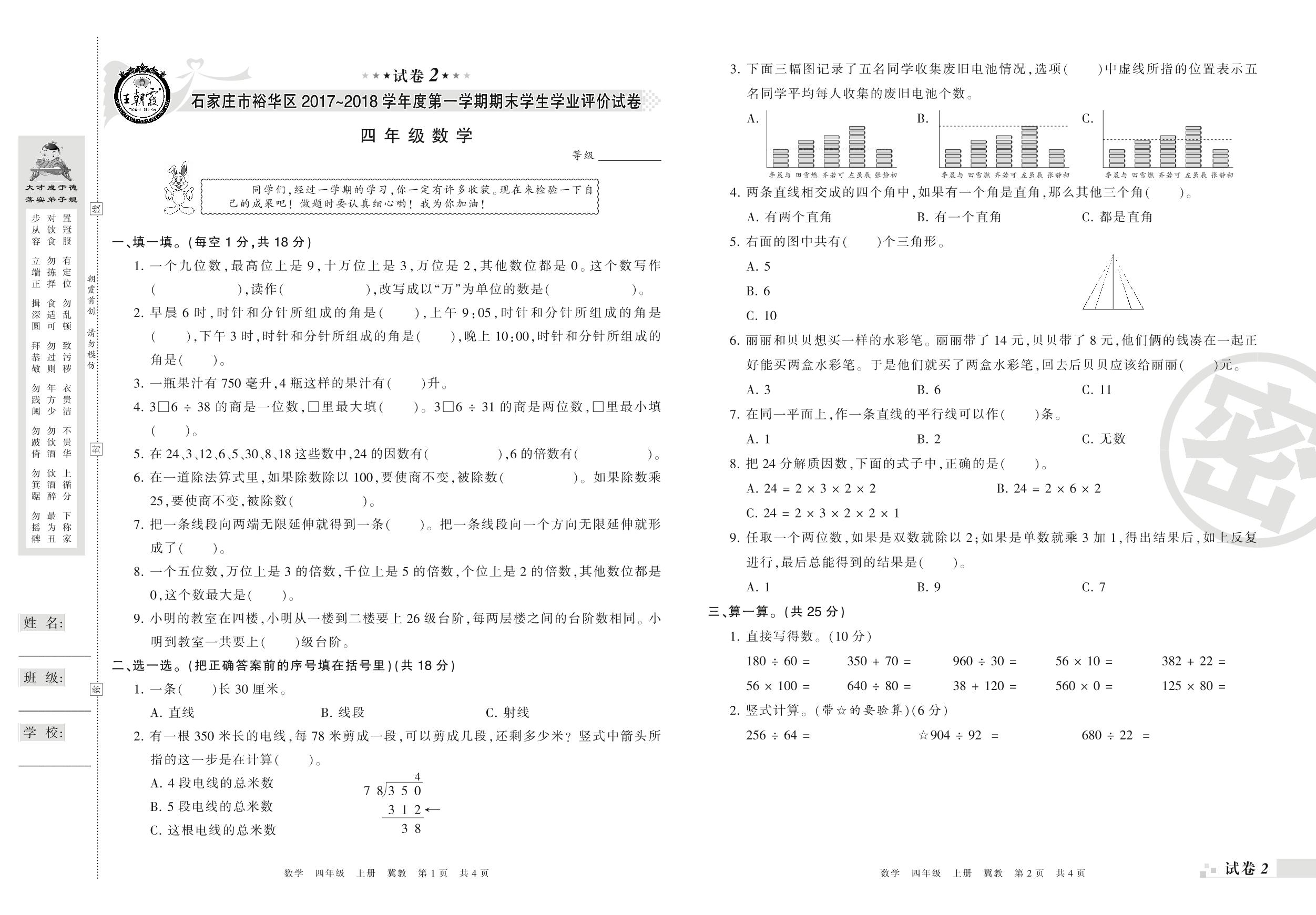 2017-2018学年第一学期石家庄市裕华区四年级数学试卷(冀教版)【2】
