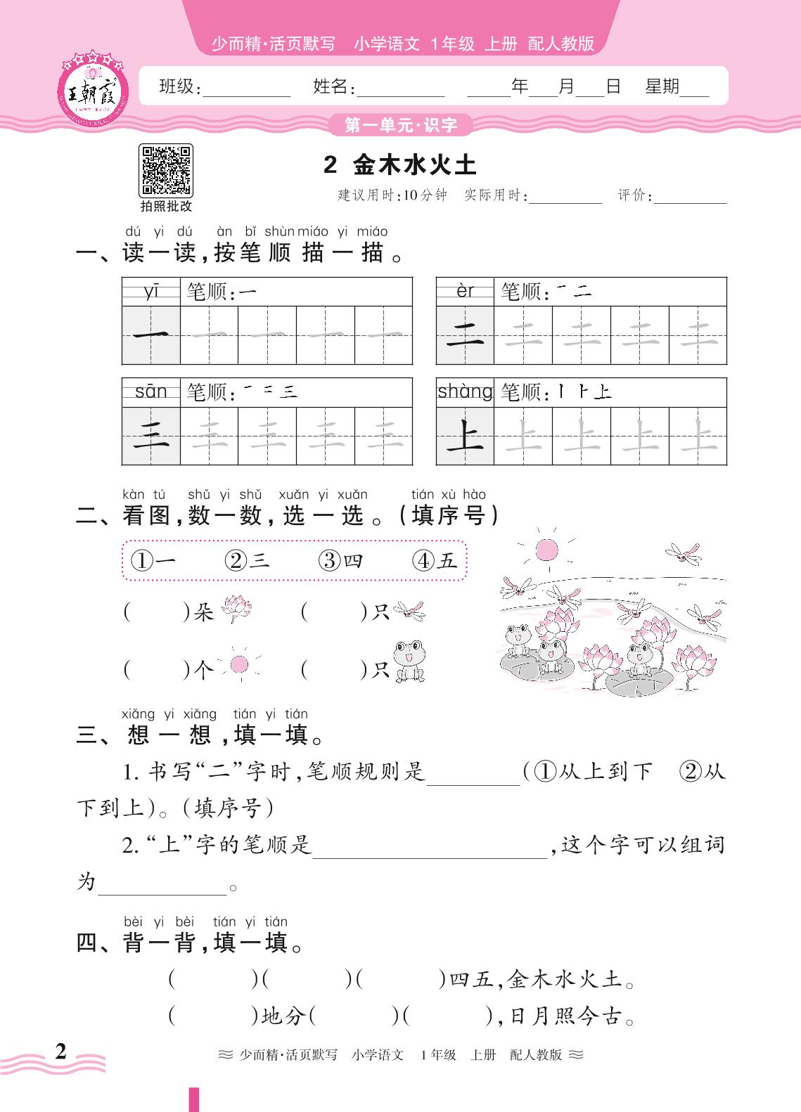 2024秋上册一年级语文人教版 第一单元 识字——2. 金木水火土_R240819140301279
