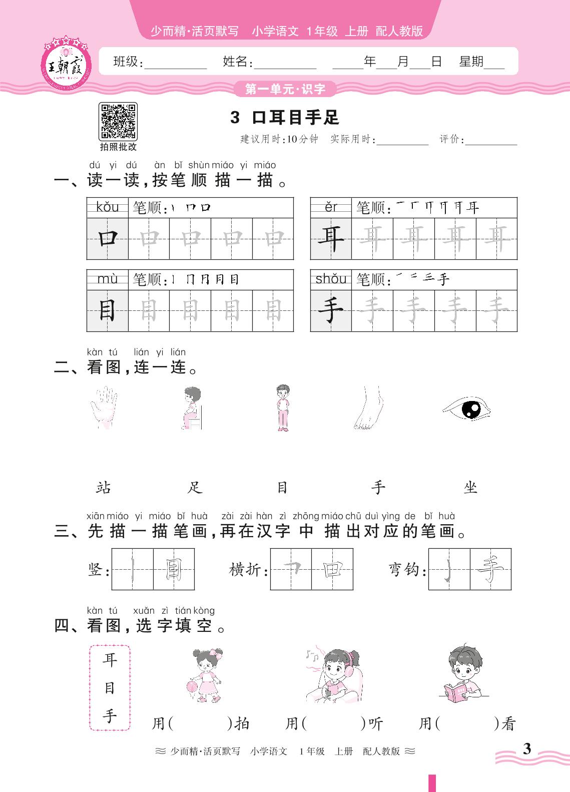 2024秋上册一年级语文人教版 第一单元 识字——3. 口耳目手足_R240819140301948
