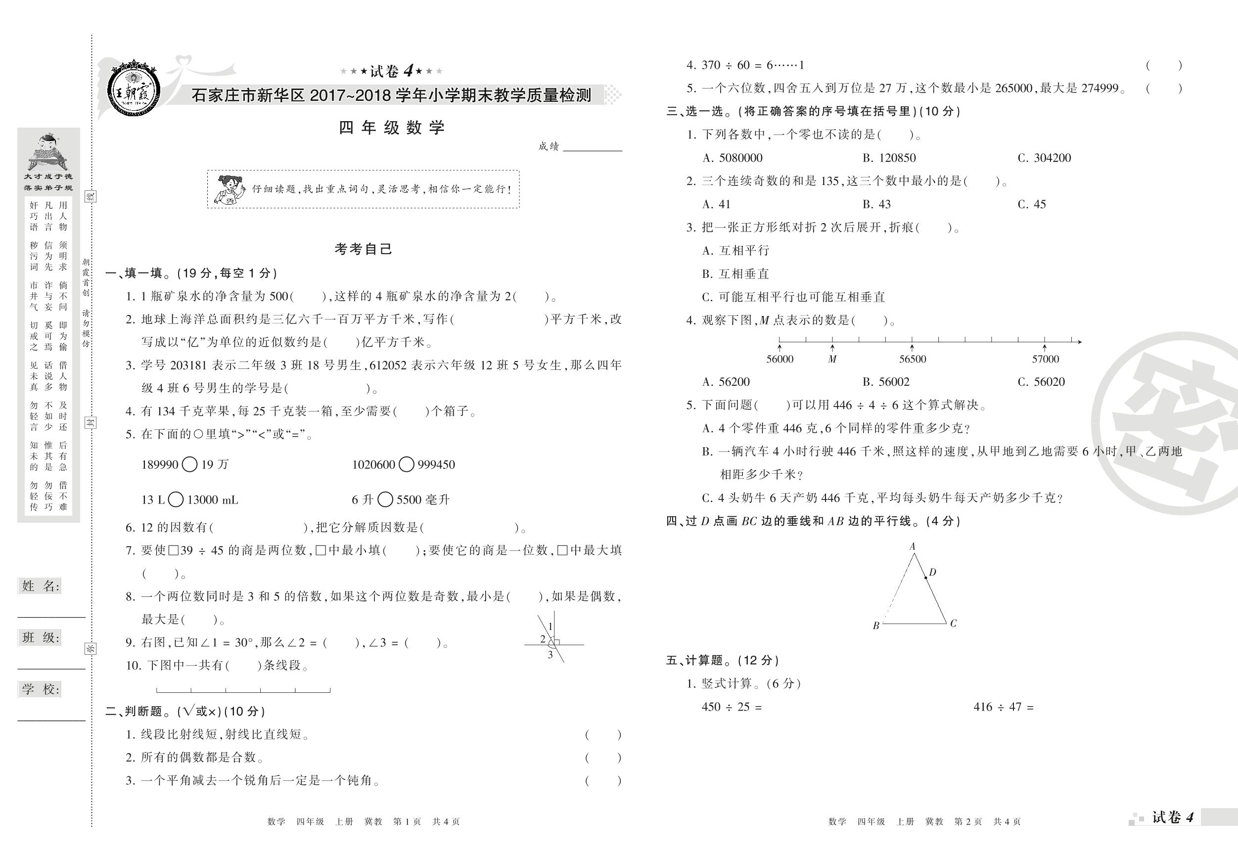 2017-2018学年第一学期石家庄市新华区四年级数学试卷(冀教版)【4】