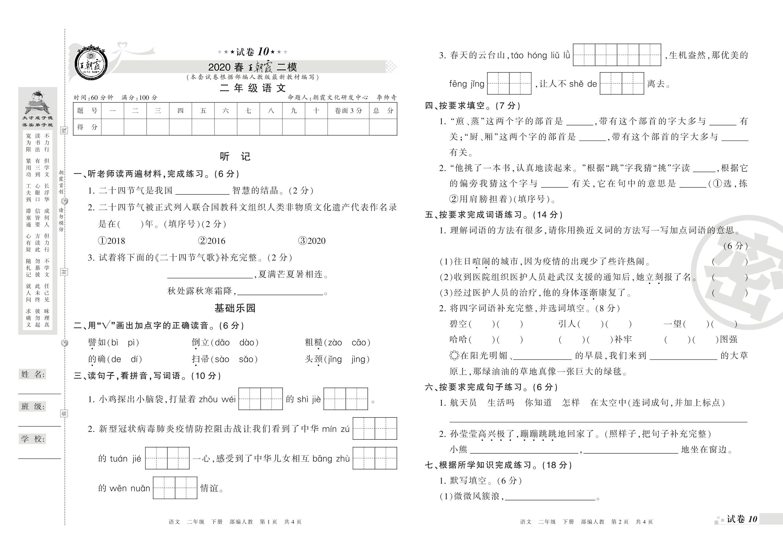 王朝霞期末模拟卷二年级下册语文(人教版)_R21080170623【10】
