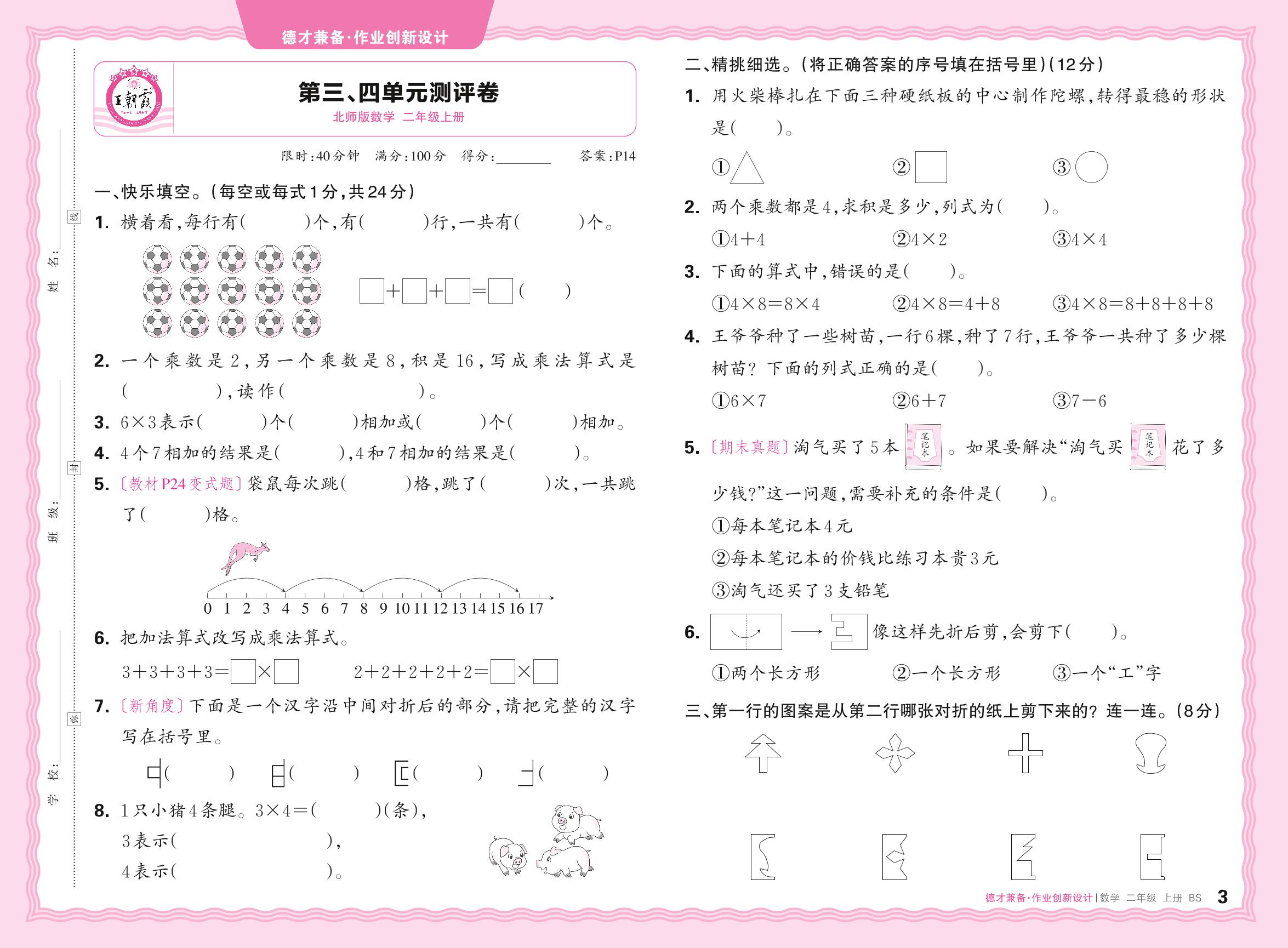 2024秋上册二年级数学北师版 第三、四单元测评卷