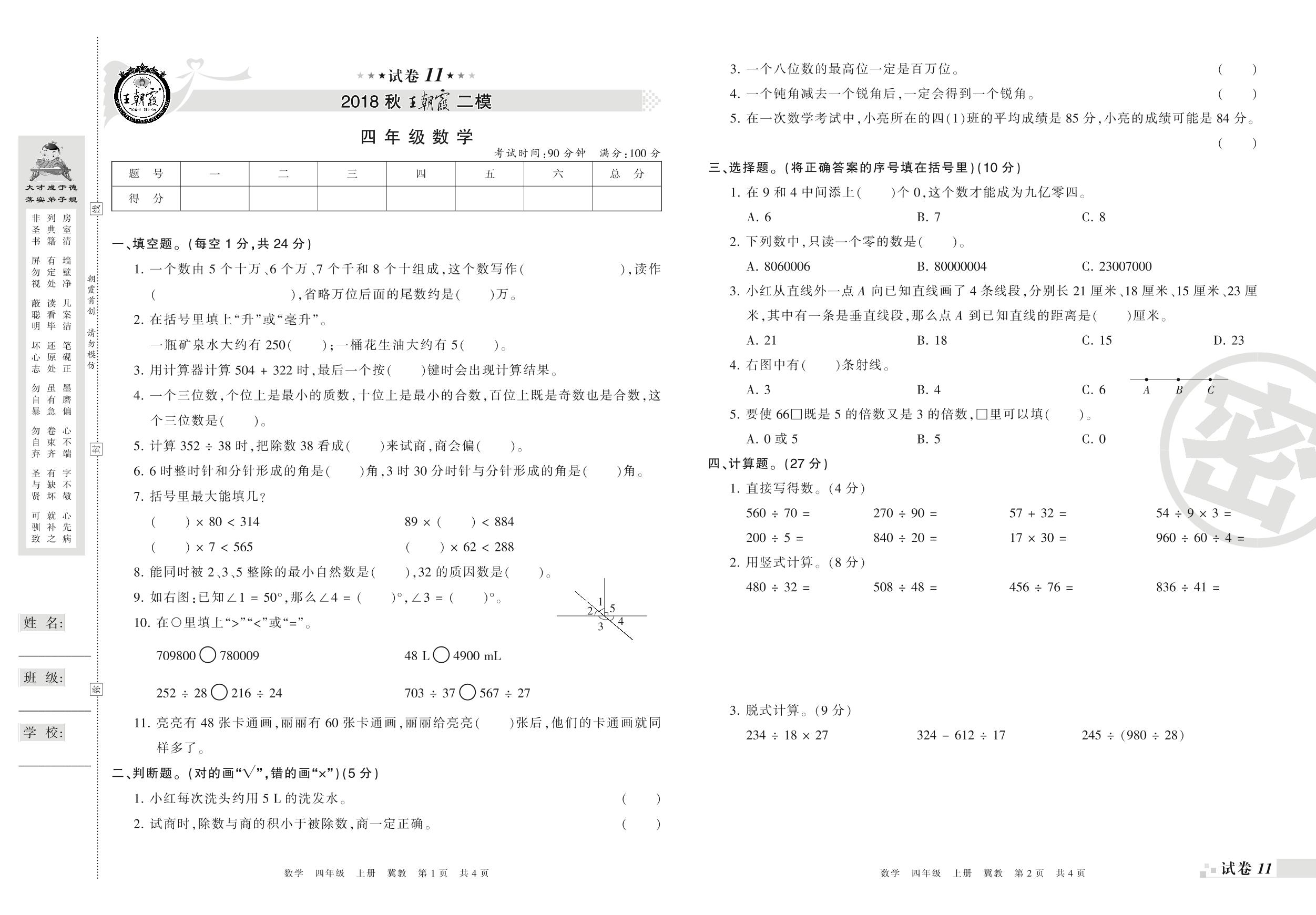王朝霞期末模拟卷四年级上册数学(冀教版)_R210804155612【11】