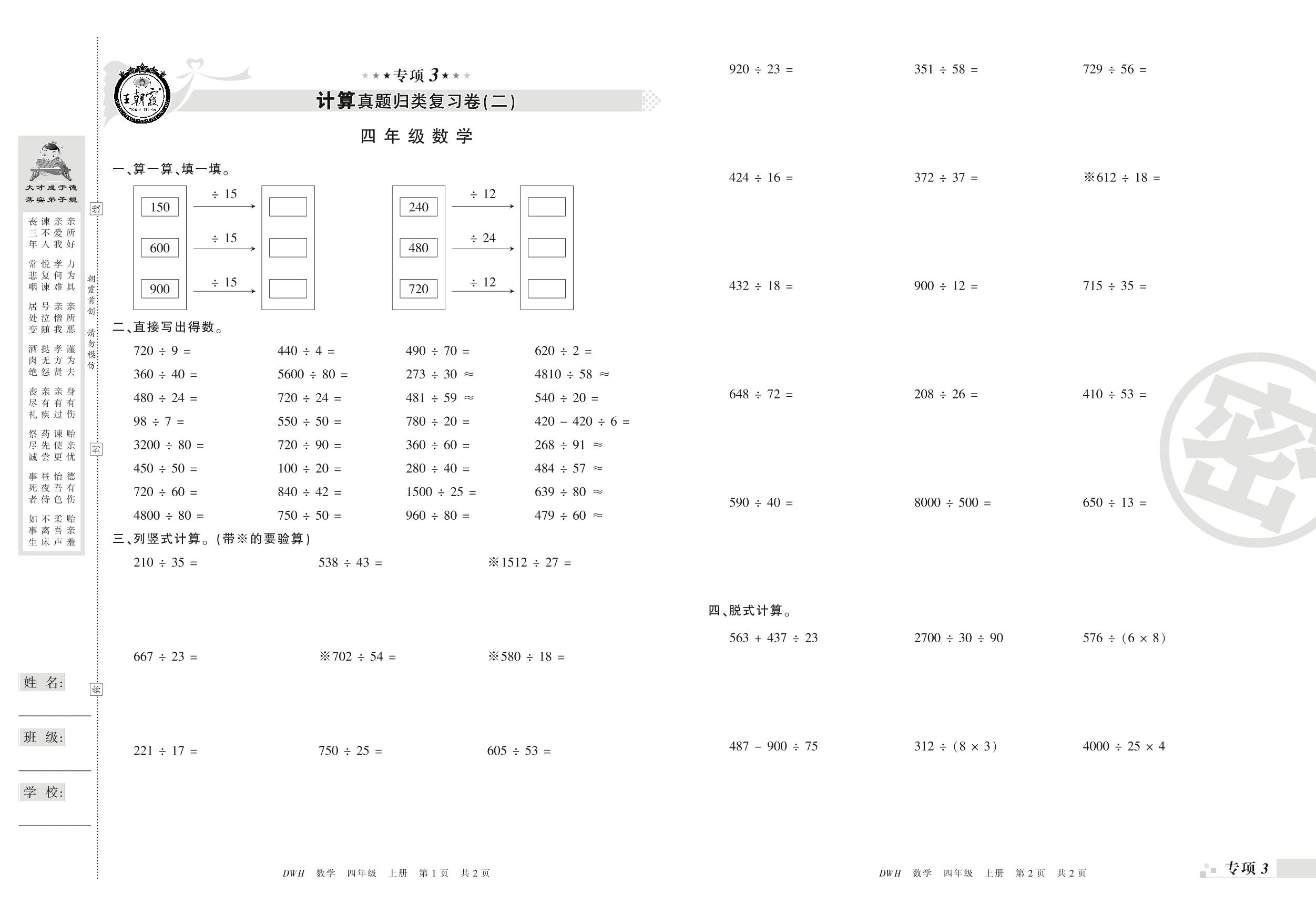 王朝霞期末专项卷——计算(二)、解决问题真题归类复习卷四年级上册数学(人教版)_R210804155637【0】