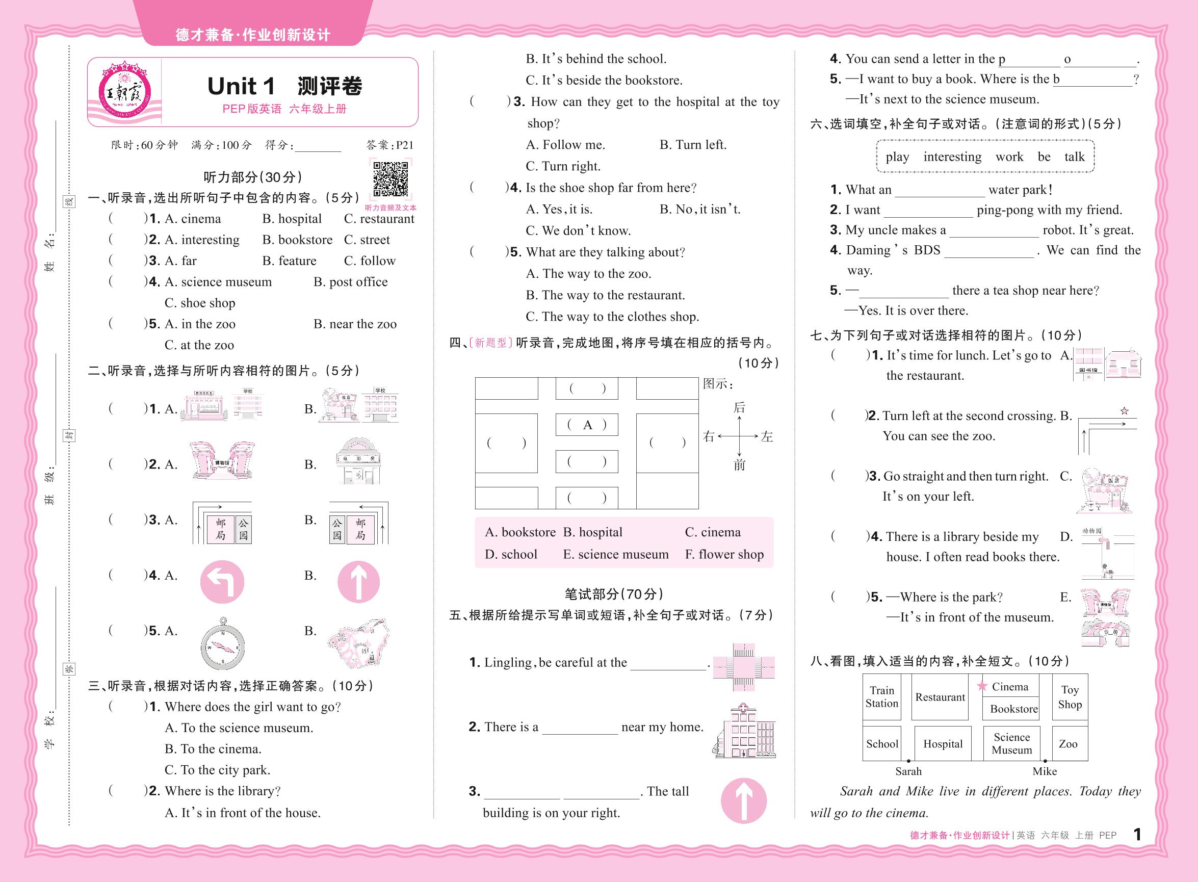 2024秋上册六年级英语人教PEP版(三起始) Unit 1 测评卷