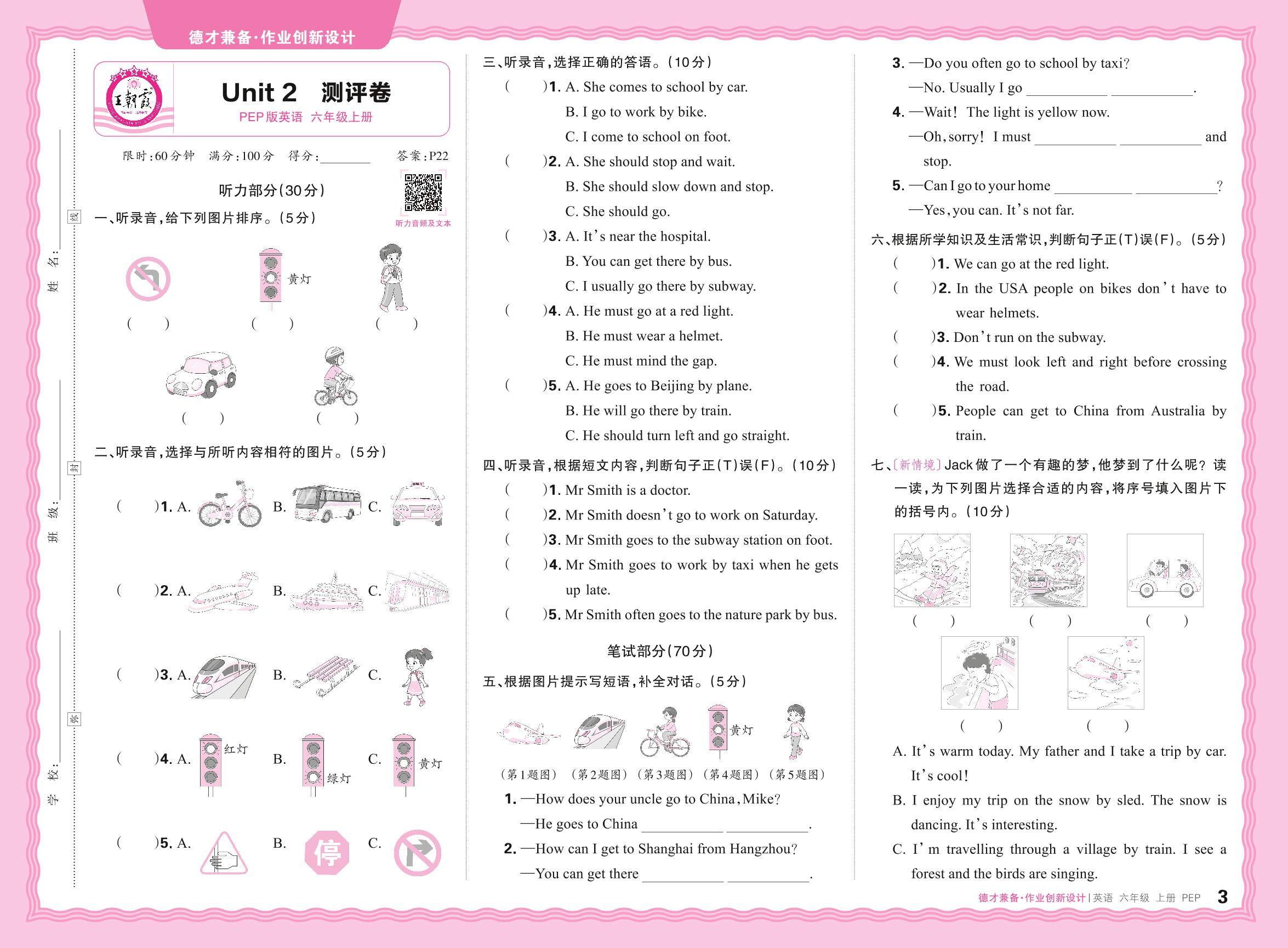 2024秋上册六年级英语人教PEP版(三起始) Unit 2 测评卷