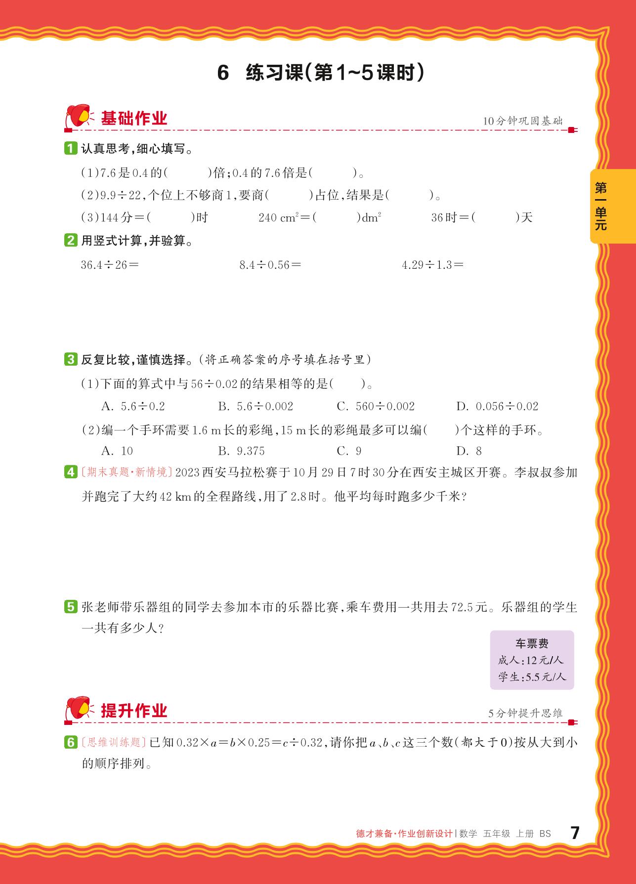 2024秋上册五年级数学北师版 第一单元 小数除法——6. 精打细算、打扫卫生、谁打电话的时间长练习课
