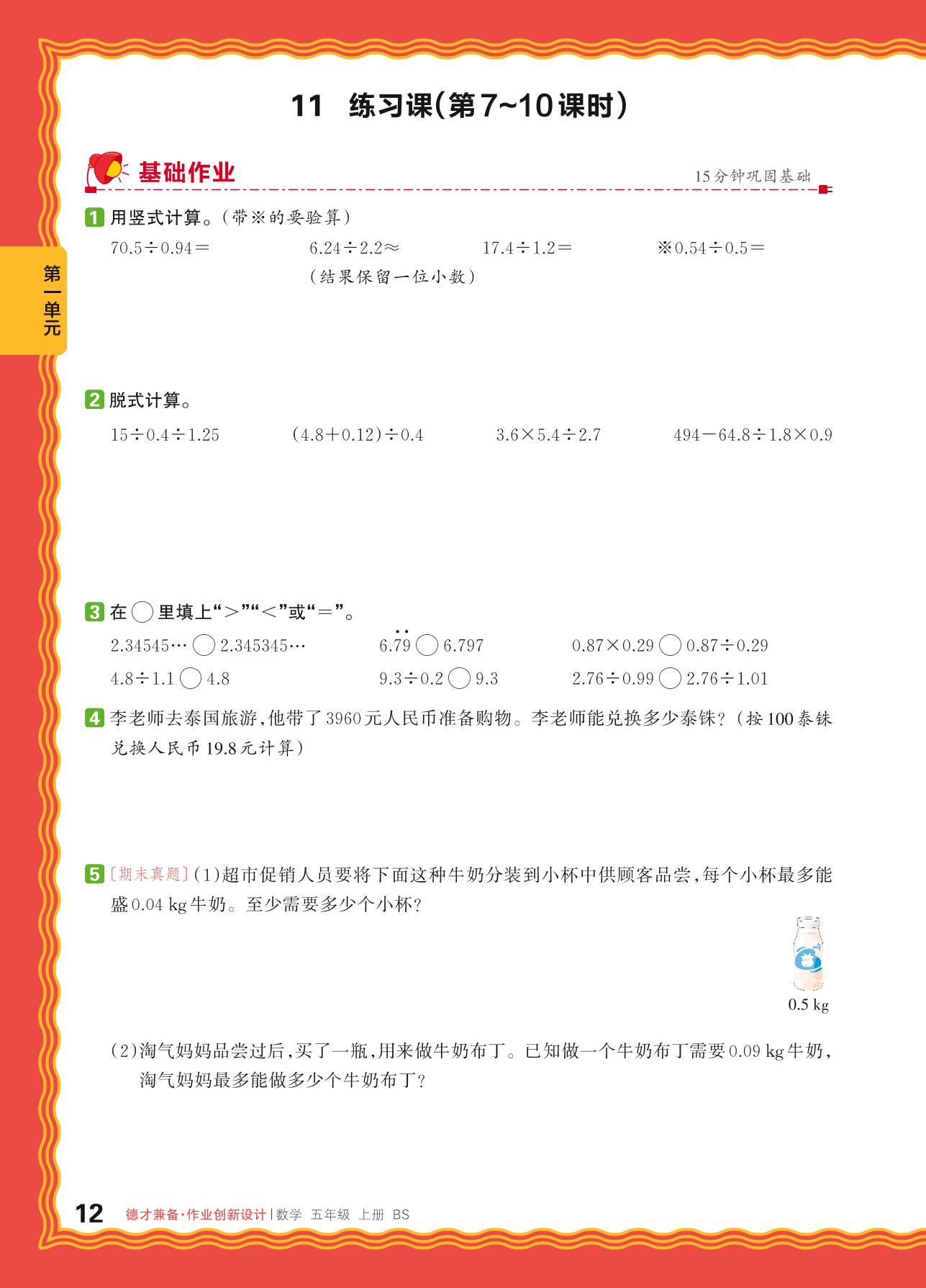 2024秋上册五年级数学北师版 第一单元 小数除法——11. 人民币兑换、除得尽吗、调查“生活垃圾”练习课