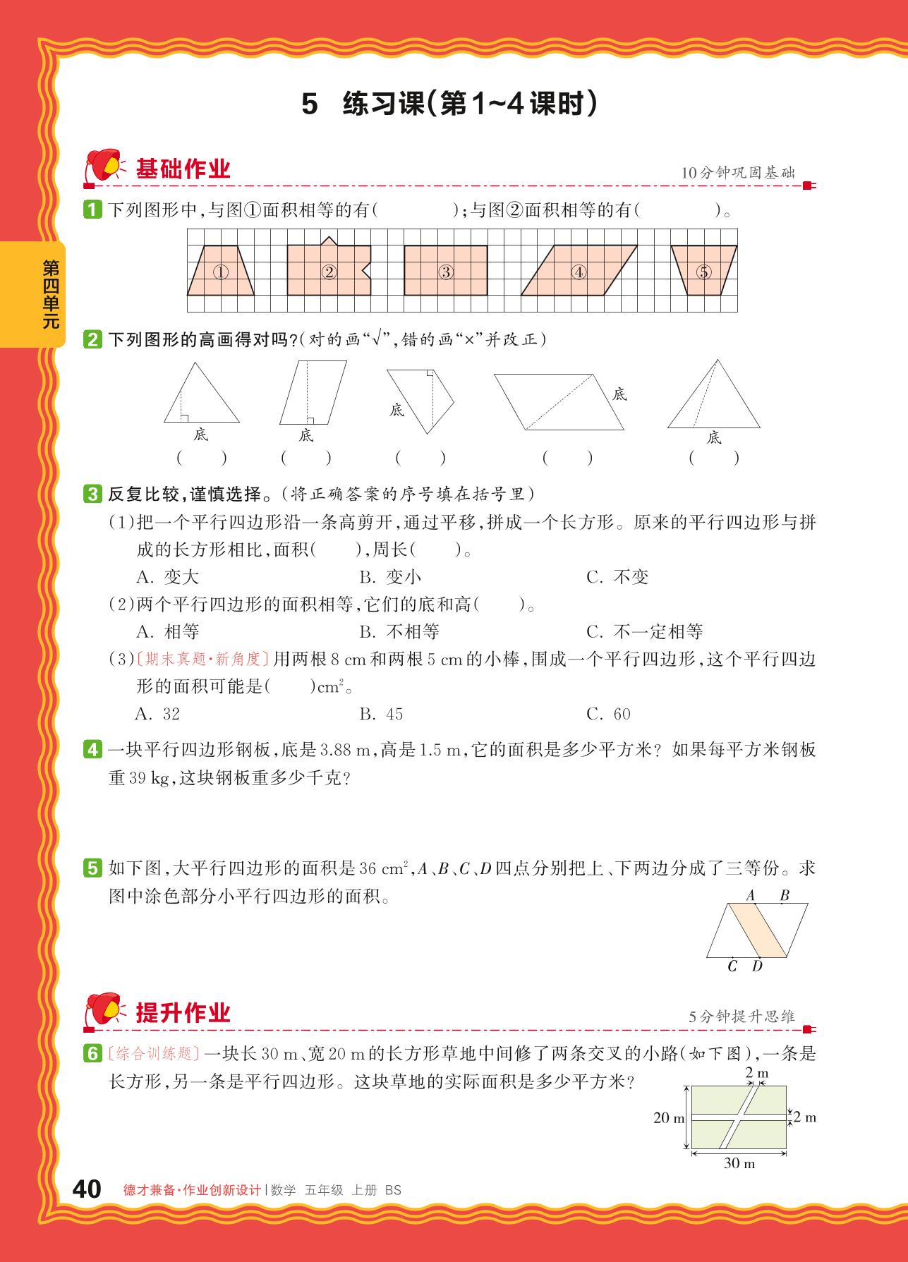2024秋上册五年级数学北师版 第四单元 多边形的面积——5. 比较图形的面积、认识底和高、探索活动:平行四边形的面积练习课