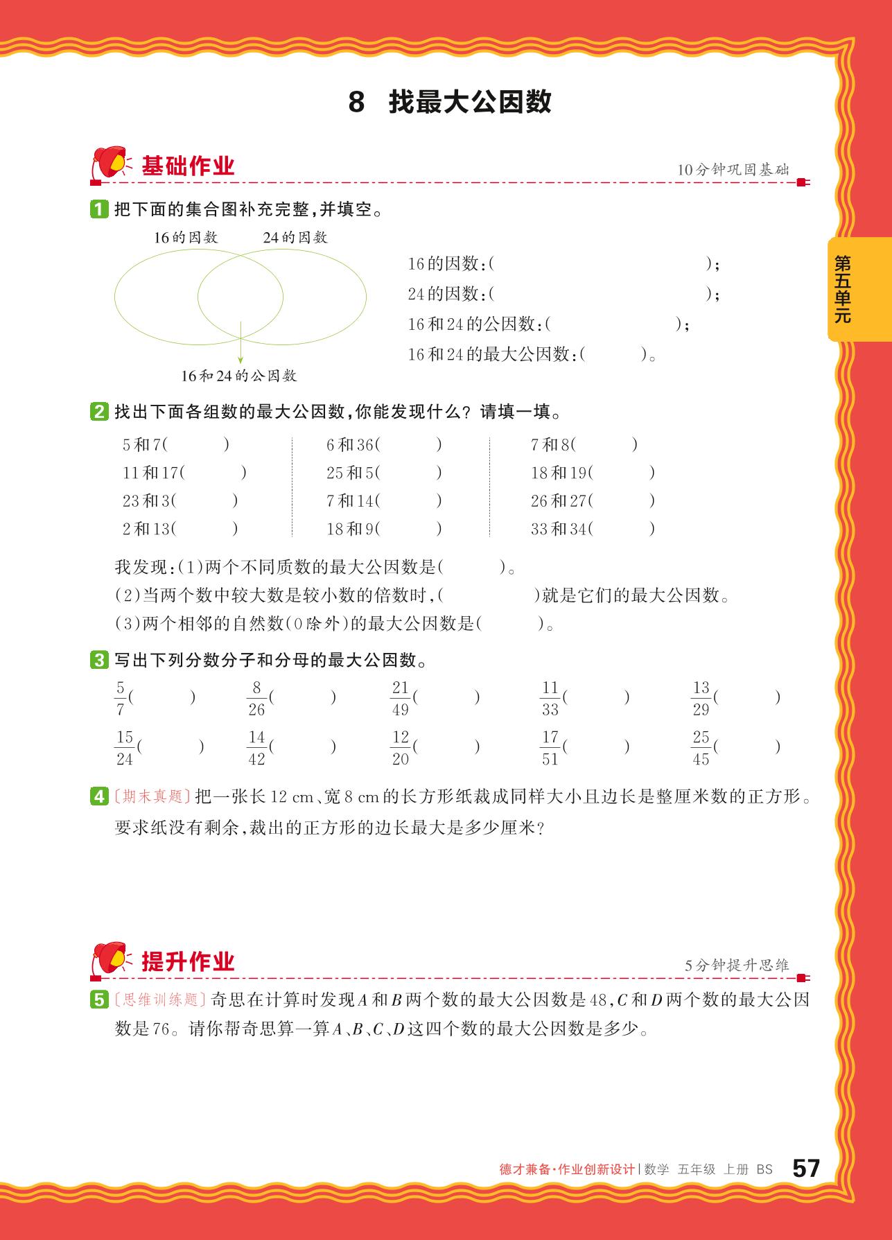 2024秋上册五年级数学北师版 第五单元 分数的意义——8. 找最大公因数