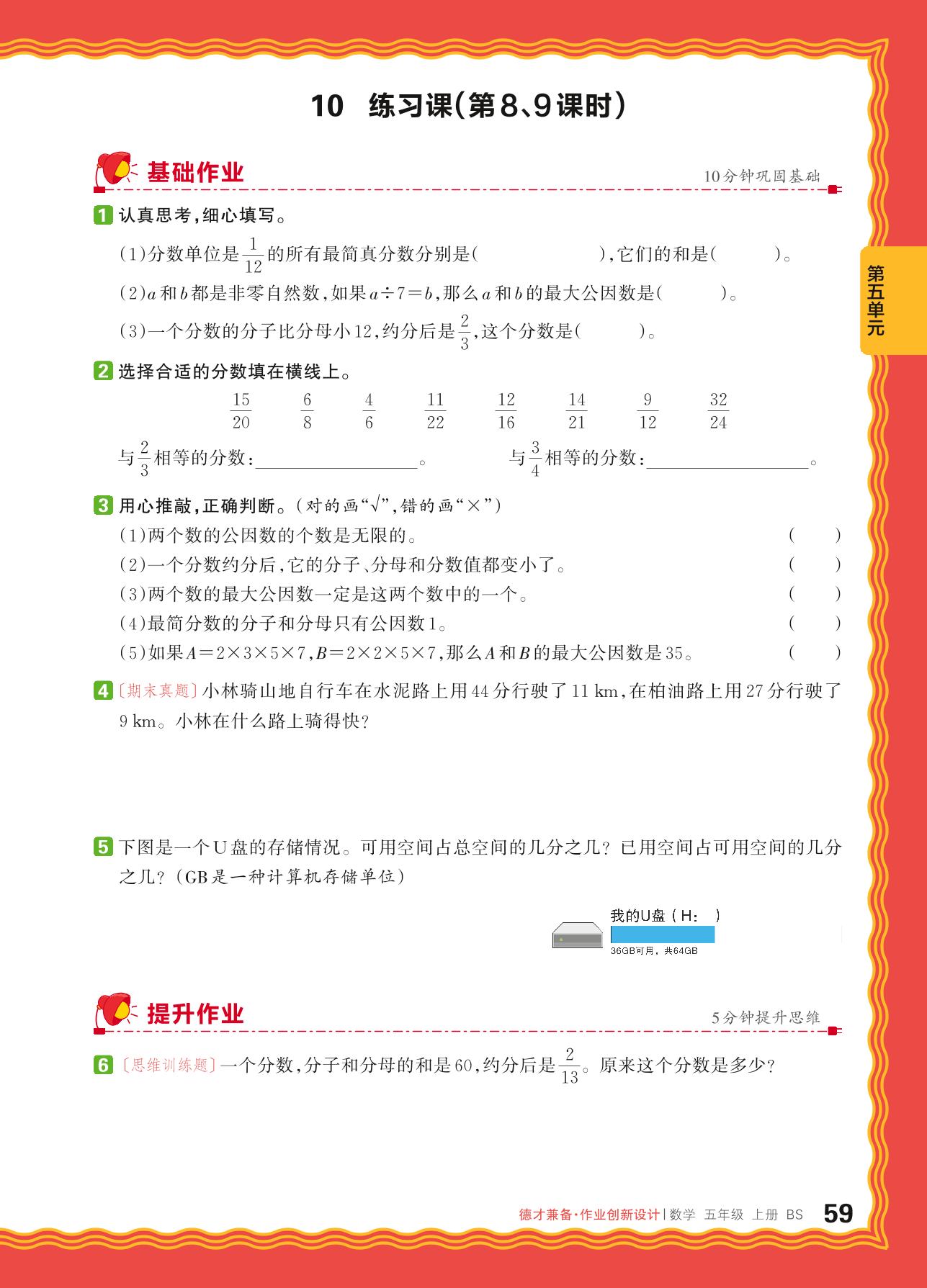 2024秋上册五年级数学北师版 第五单元 分数的意义——10. 找最大公因数、约分练习课