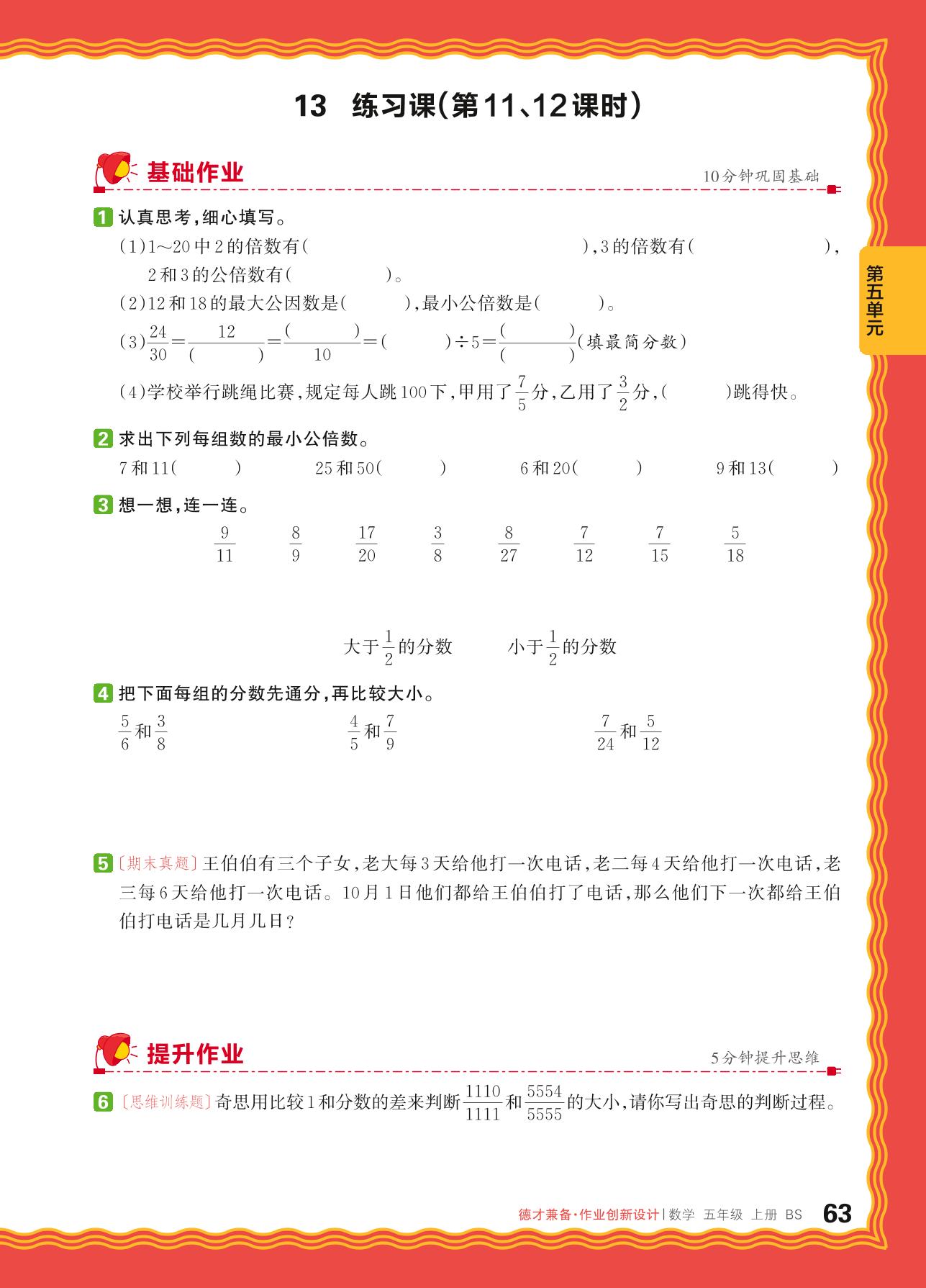 2024秋上册五年级数学北师版 第五单元 分数的意义——13. 找最小公倍数、分数的大小练习课