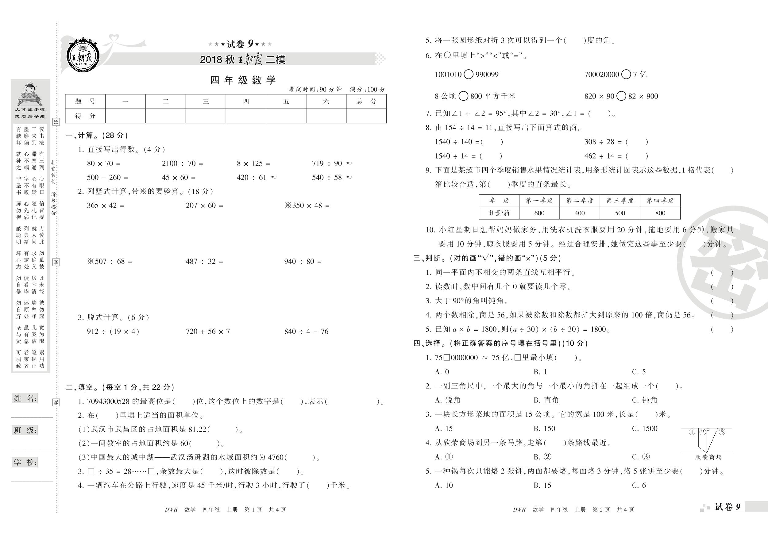 王朝霞期末模拟卷四年级上册数学(人教版)_R210804155720【9】