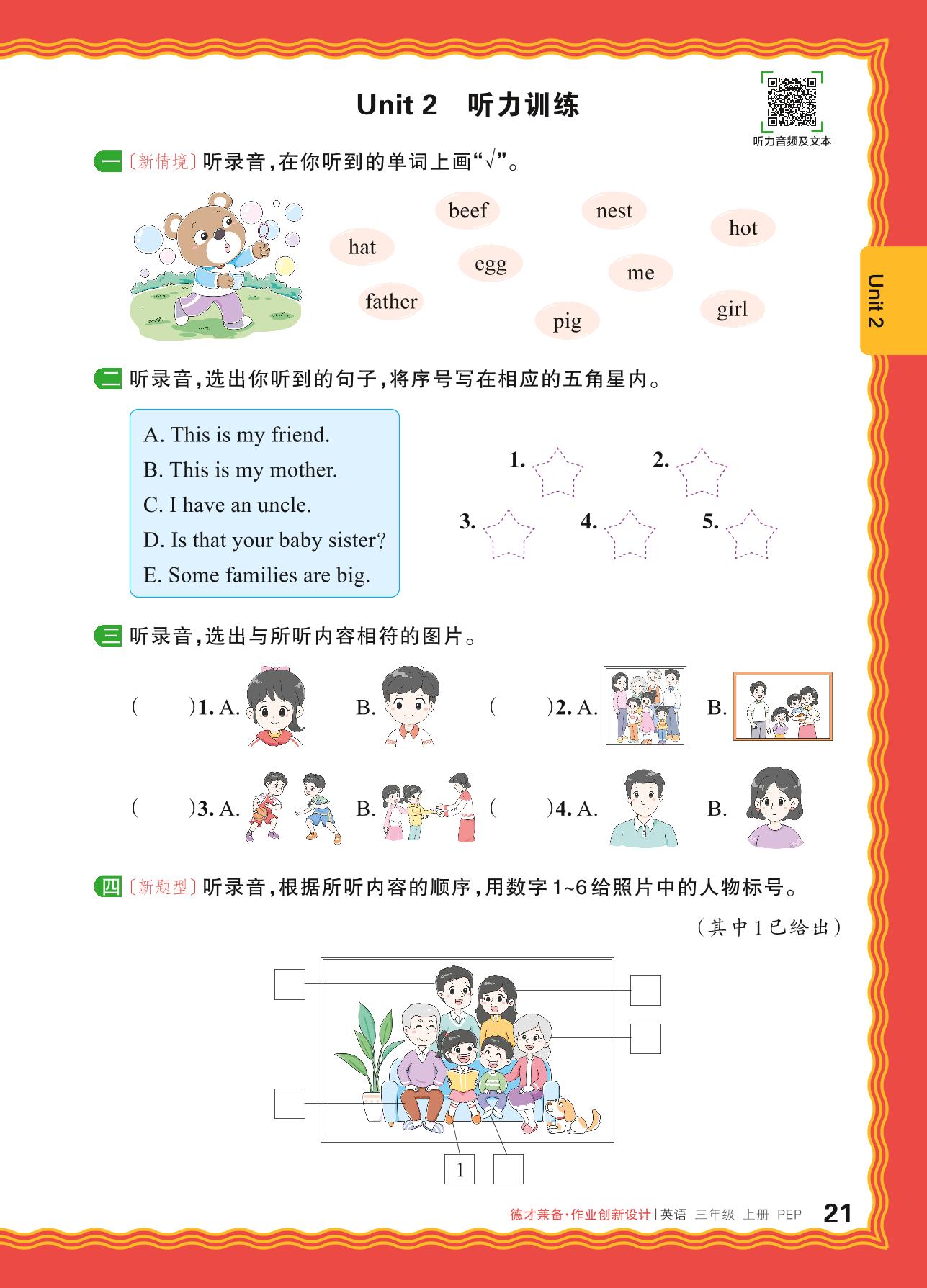 2024秋上册三年级英语人教PEP版(三起始) Unit 2 听力训练