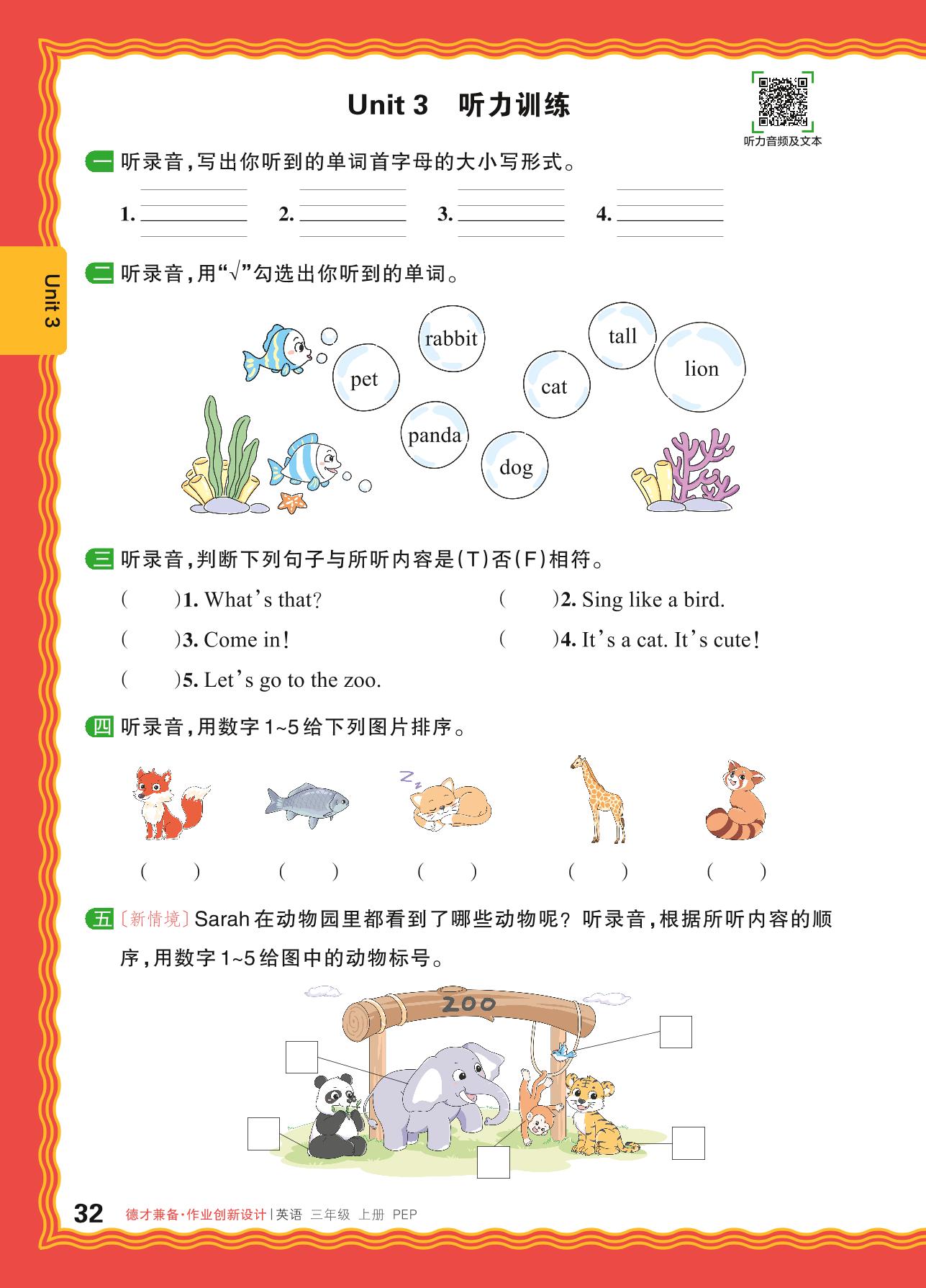 2024秋上册三年级英语人教PEP版(三起始) Unit 3 听力训练