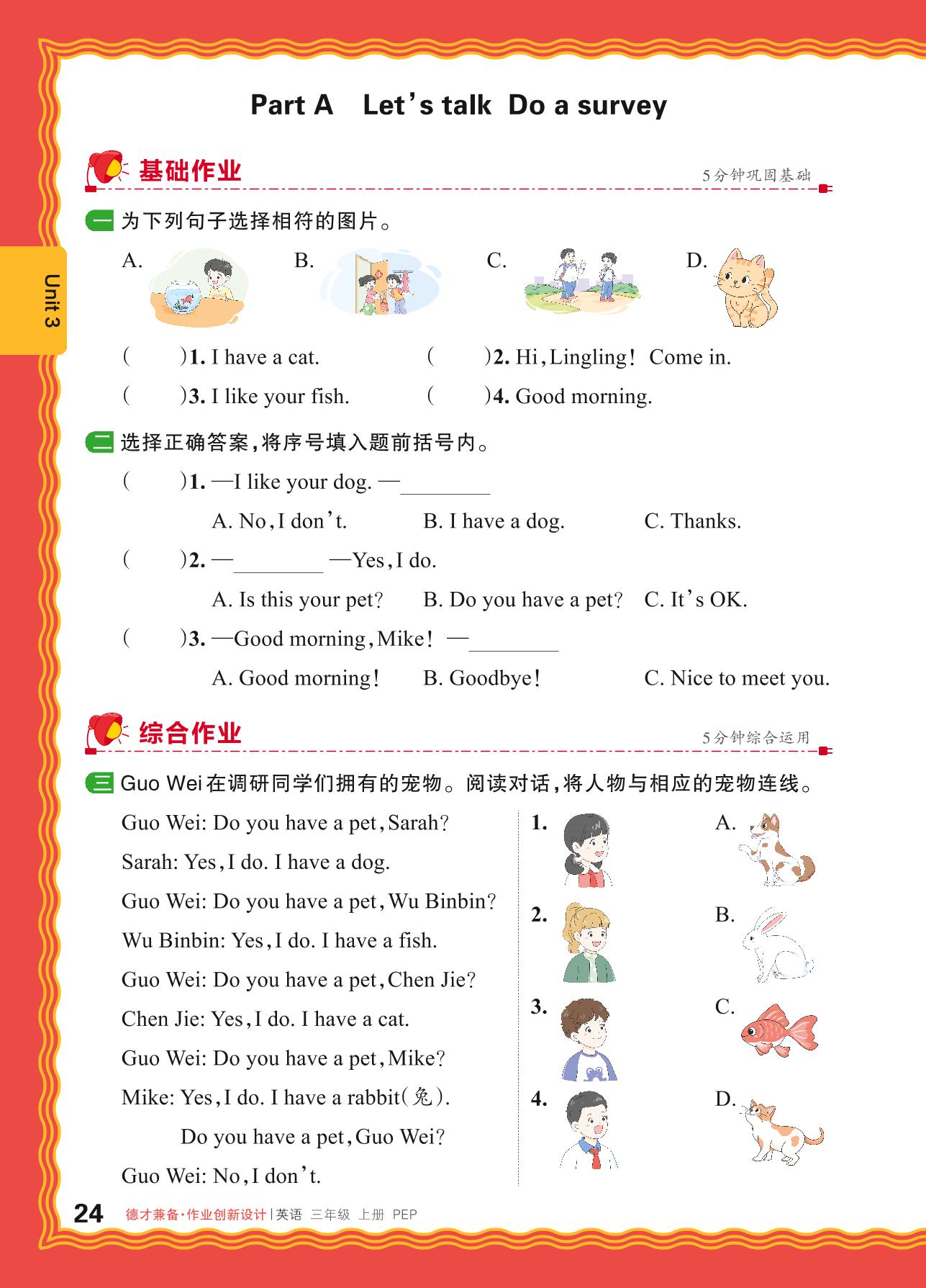 2024秋上册三年级英语人教PEP版(三起始) Unit 3—Part A Let's talk Do a survey