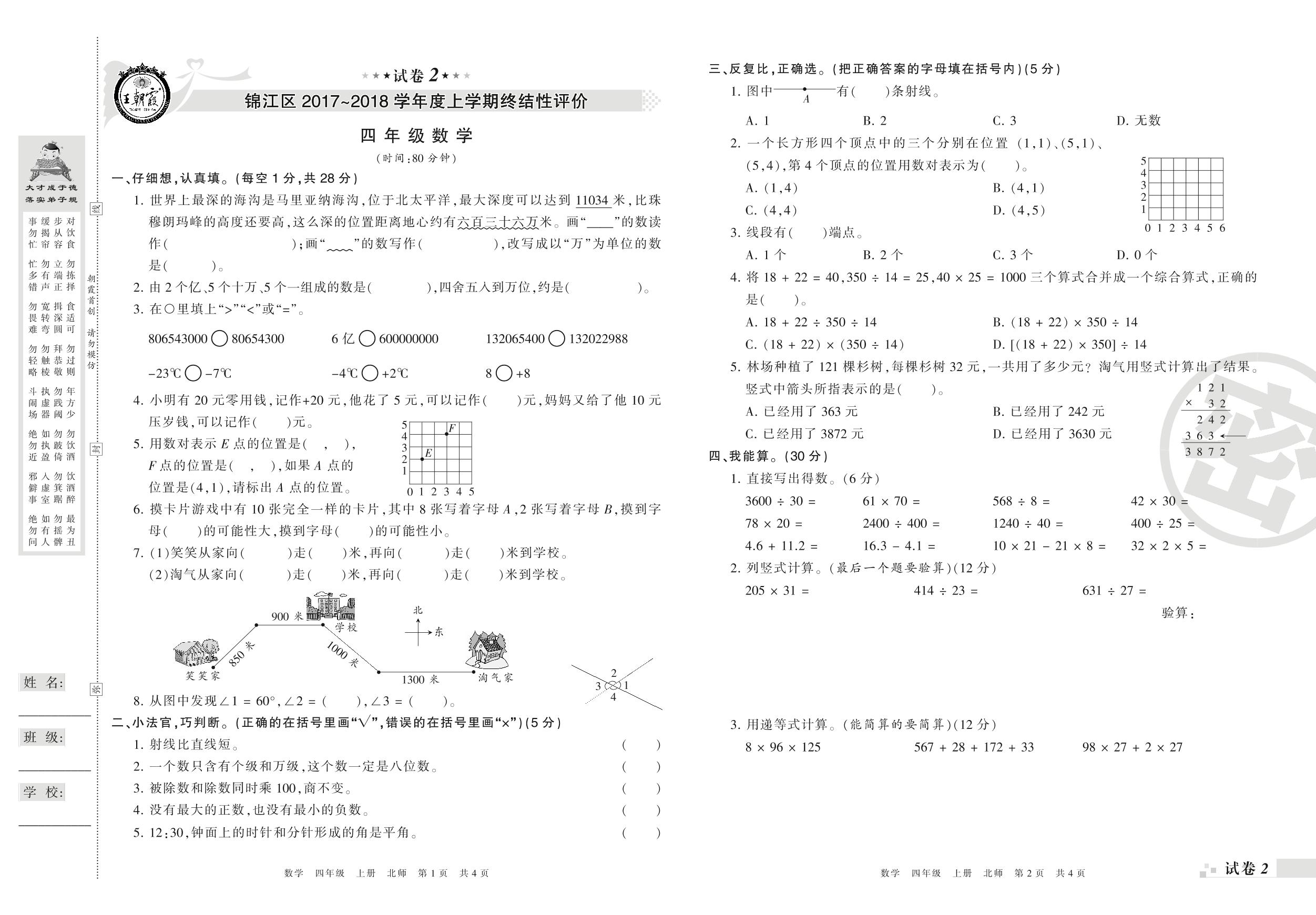 2017-2018学年第一学期成都市锦江区四年级数学试卷(北师版)【2】