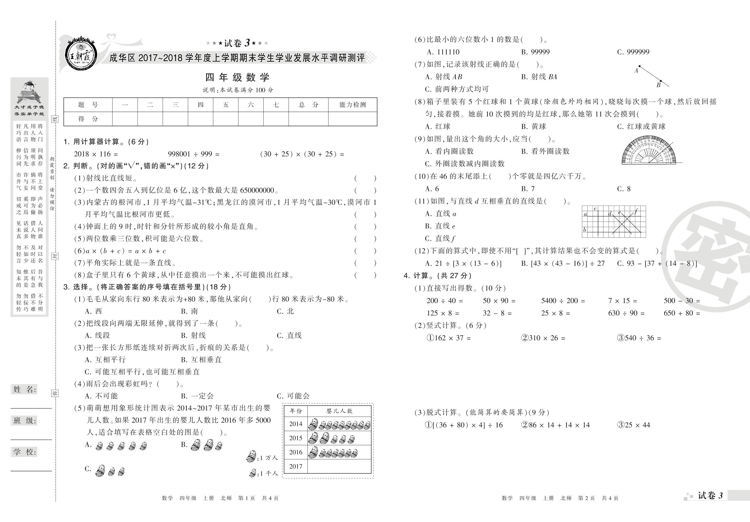 2017-2018学年第一学期成都市成华区四年级数学试卷(北师版)【3】