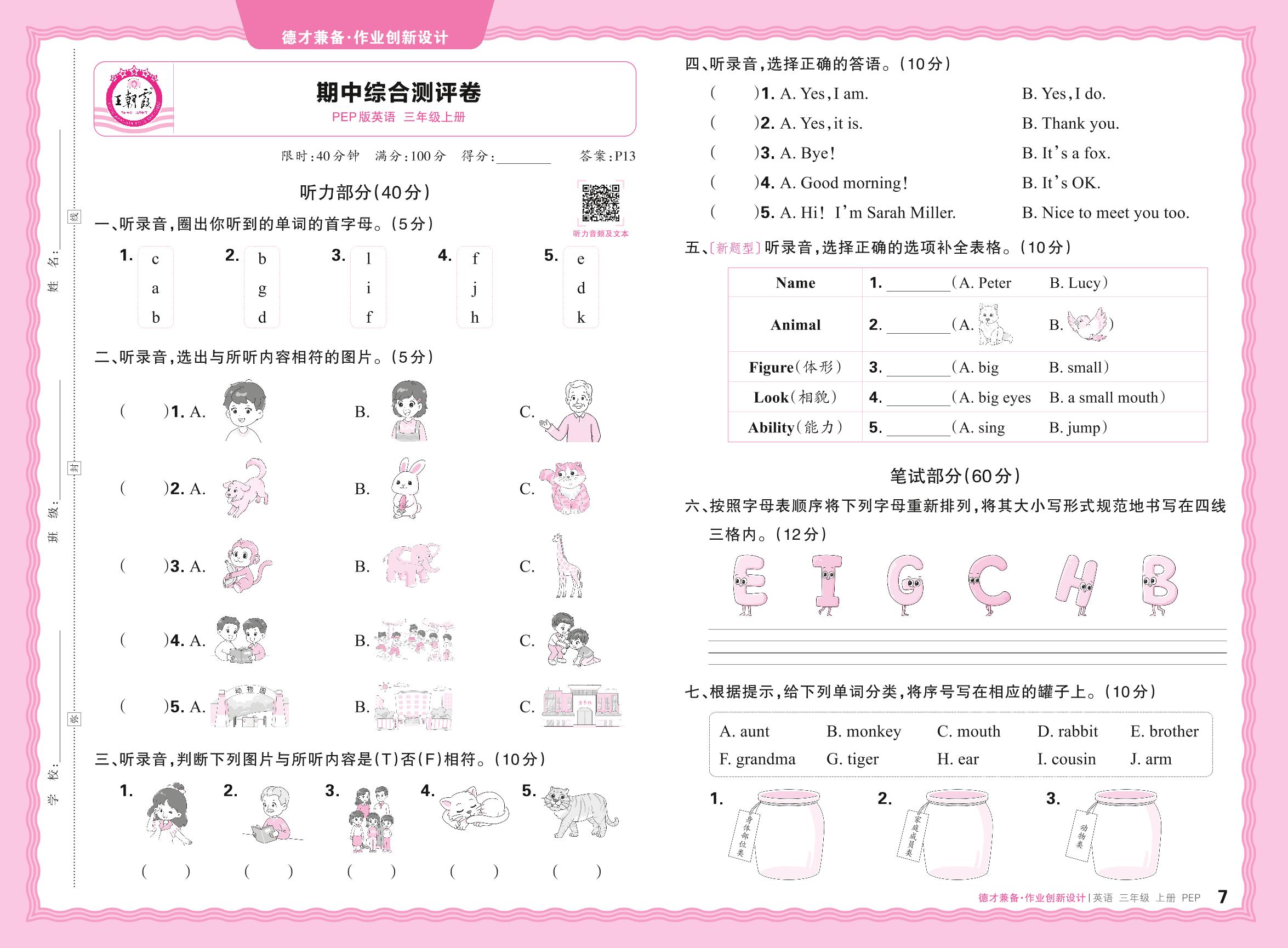 2024秋上册三年级英语人教PEP版(三起始) 期中综合测评卷