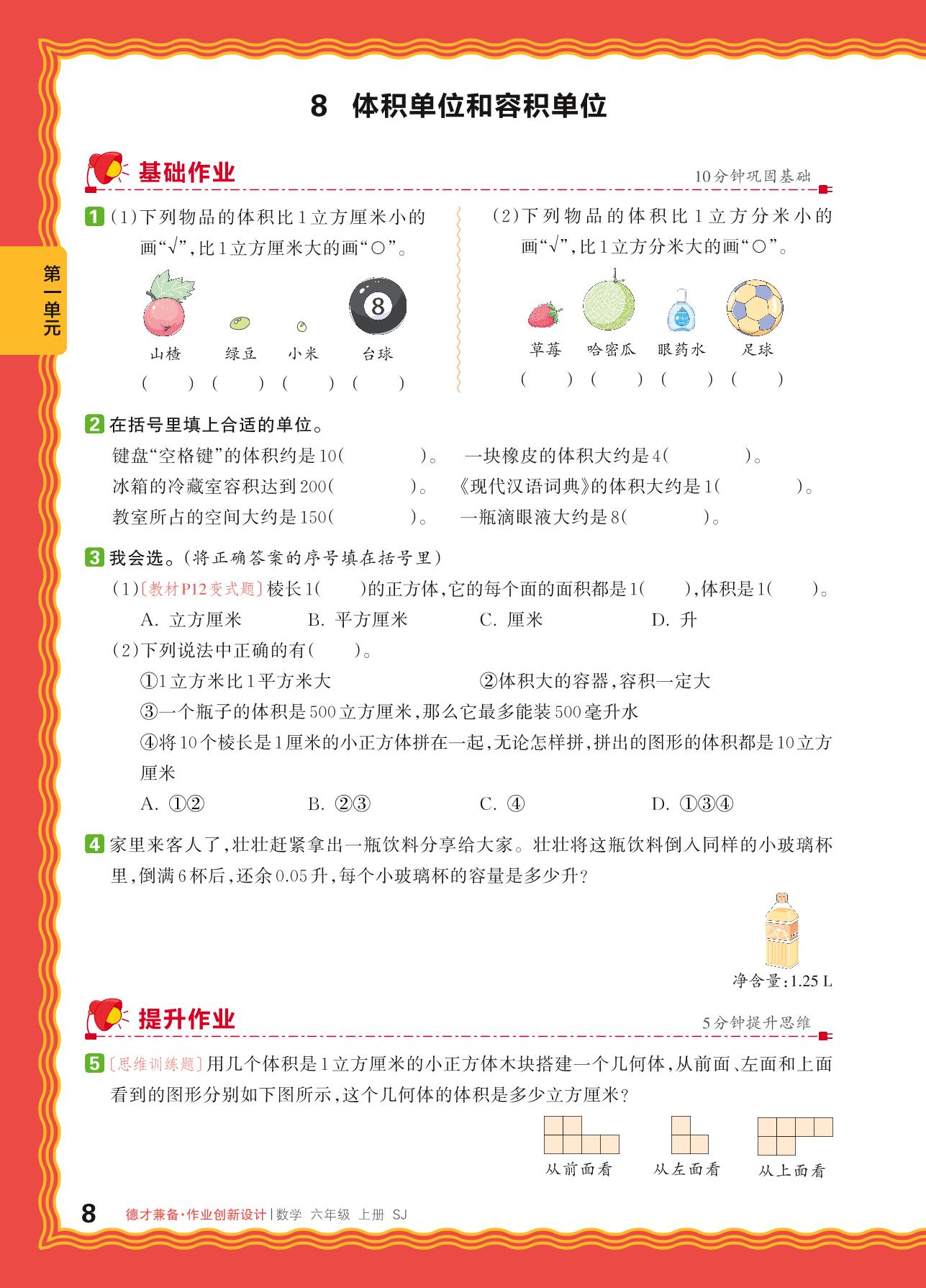 2024秋上册六年级数学苏教版 第一单元 长方体和正方体——8. 体积单位和容积单位