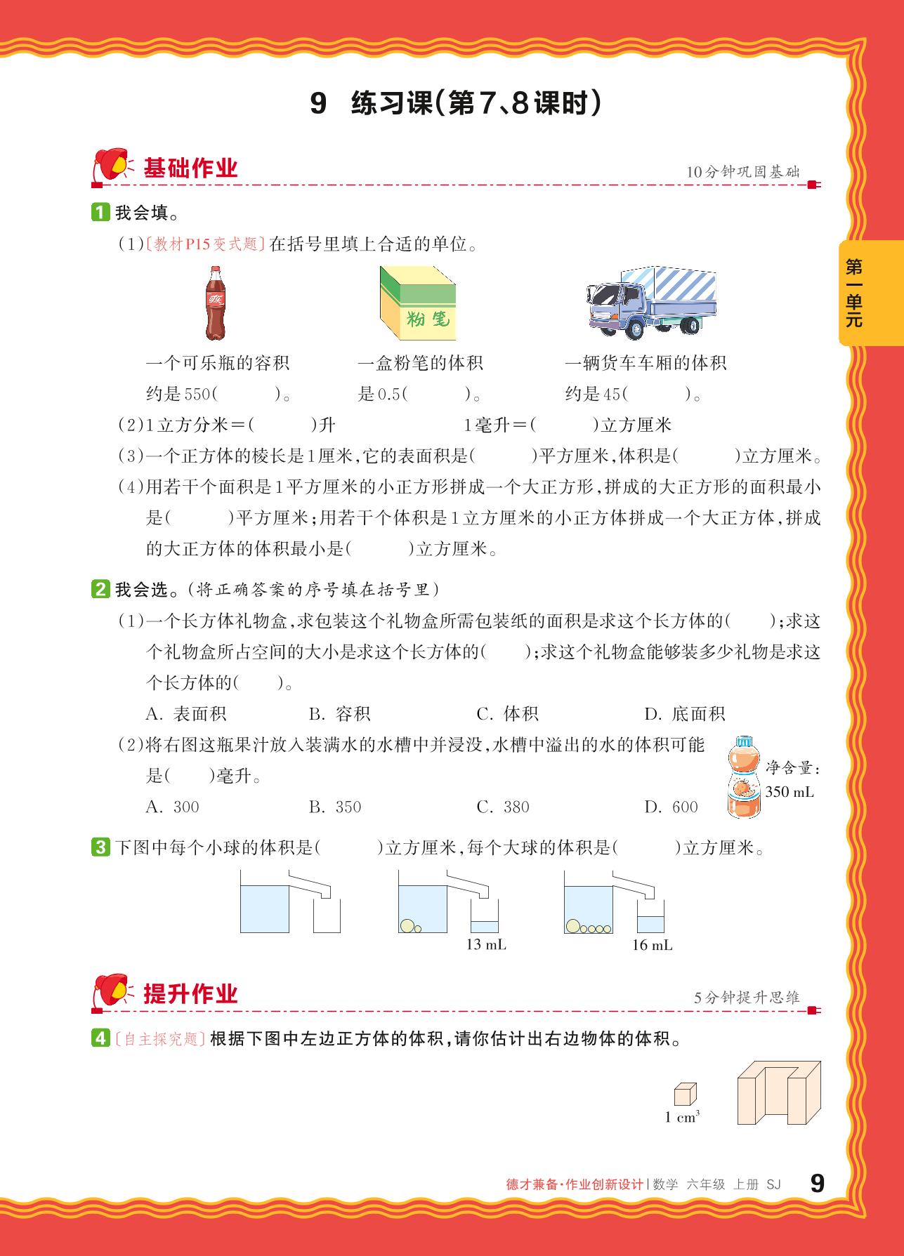 2024秋上册六年级数学苏教版 第一单元 长方体和正方体——9. 体积和容积、体积单位和容积单位练习课