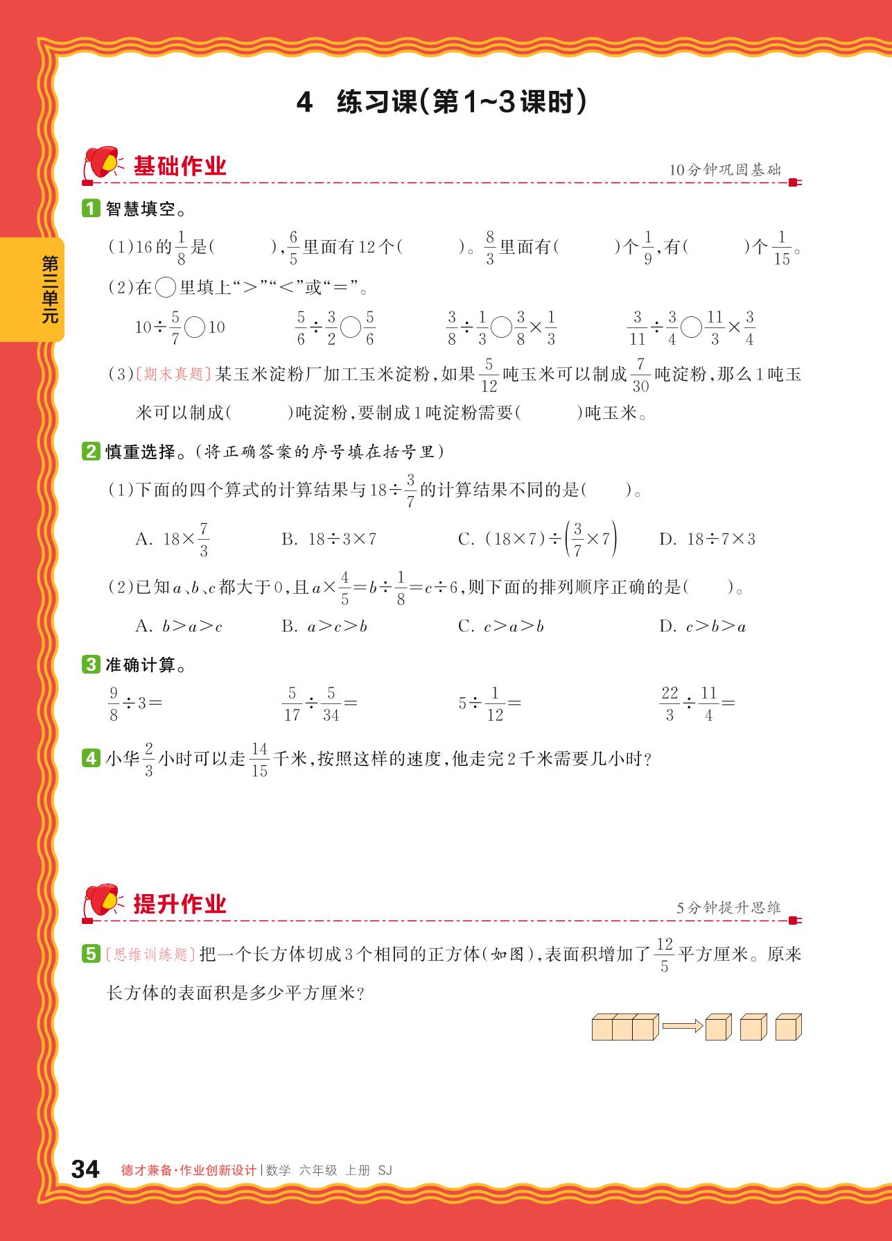 2024秋上册六年级数学苏教版 第三单元 分数除法——4. 分数除以整数、整数除以分数、分数除以分数练习课