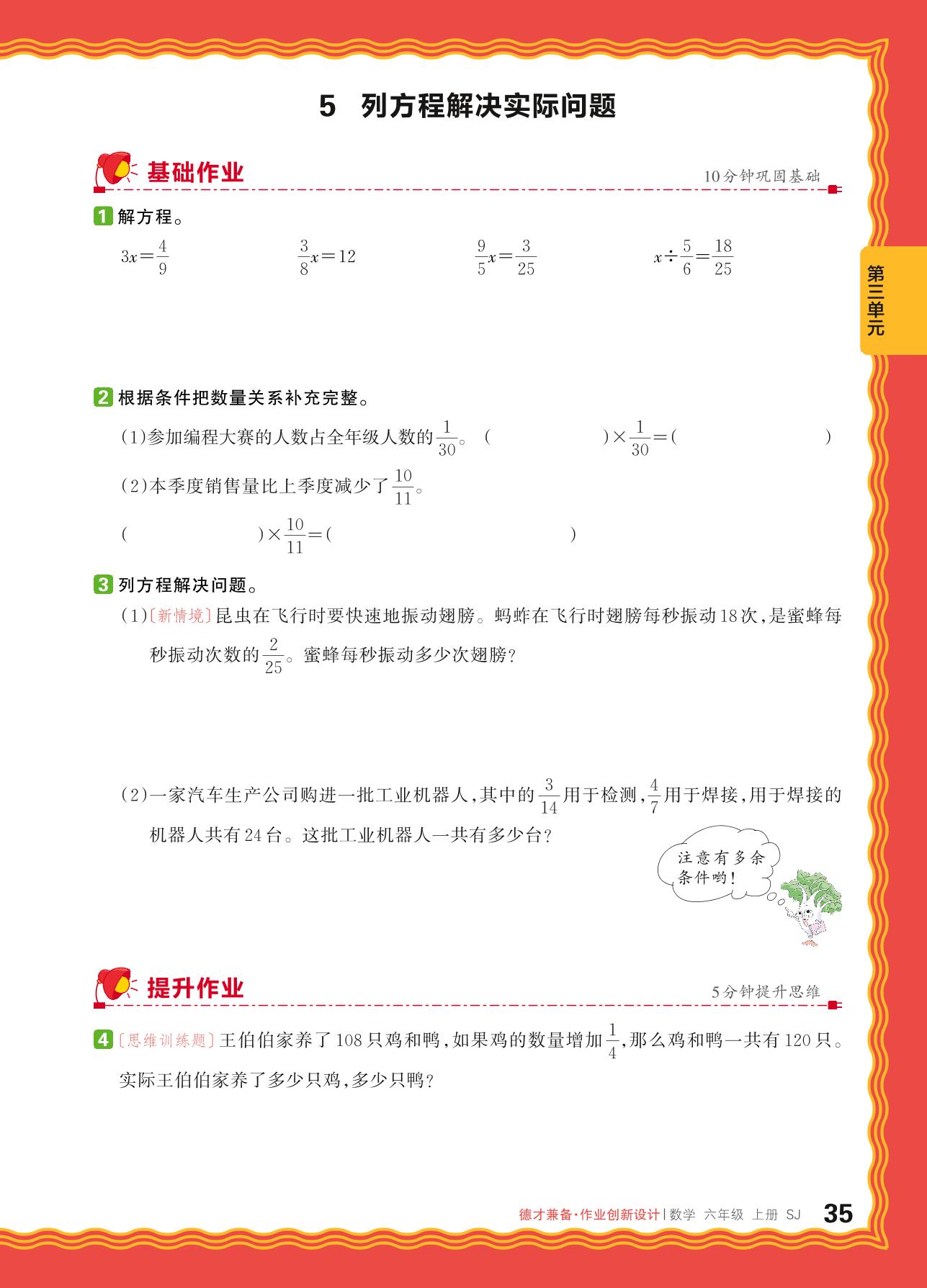 2024秋上册六年级数学苏教版 第三单元 分数除法——5. 列方程解决实际问题