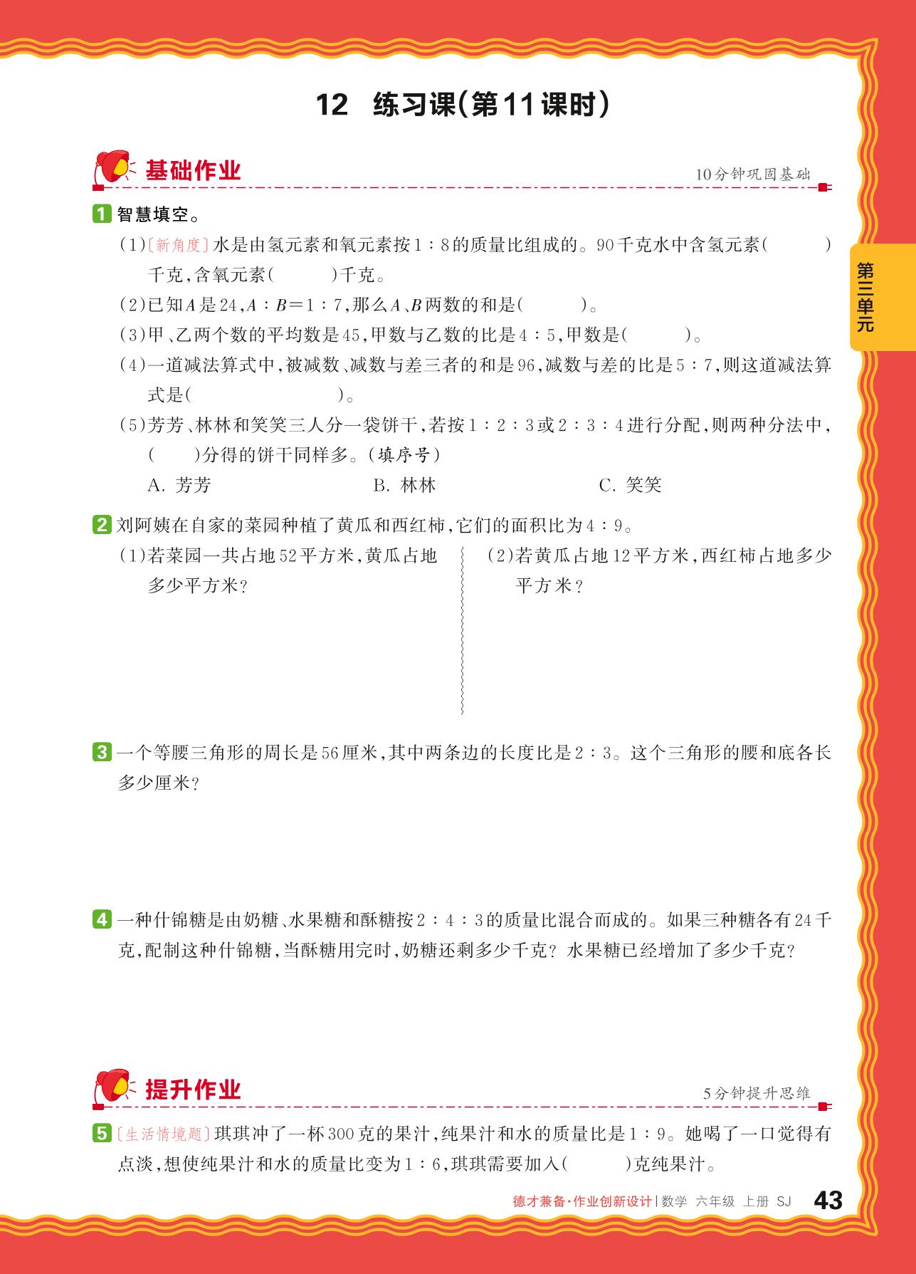 2024秋上册六年级数学苏教版 第三单元 分数除法——12. 按比分配的实际问题练习课