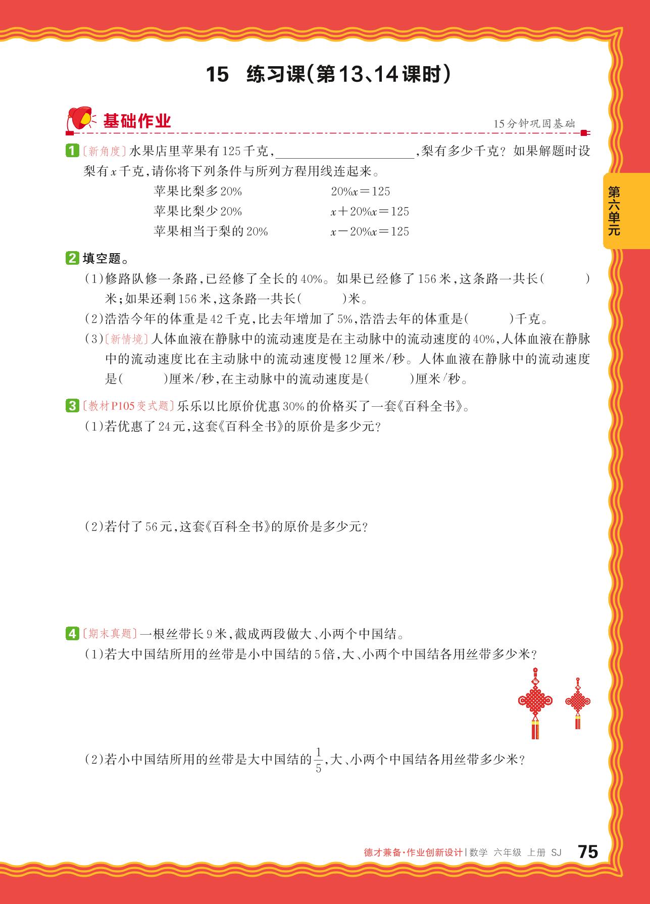 2024秋上册六年级数学苏教版 第六单元 百分数——15. 稍复杂的百分数实际问题练习课