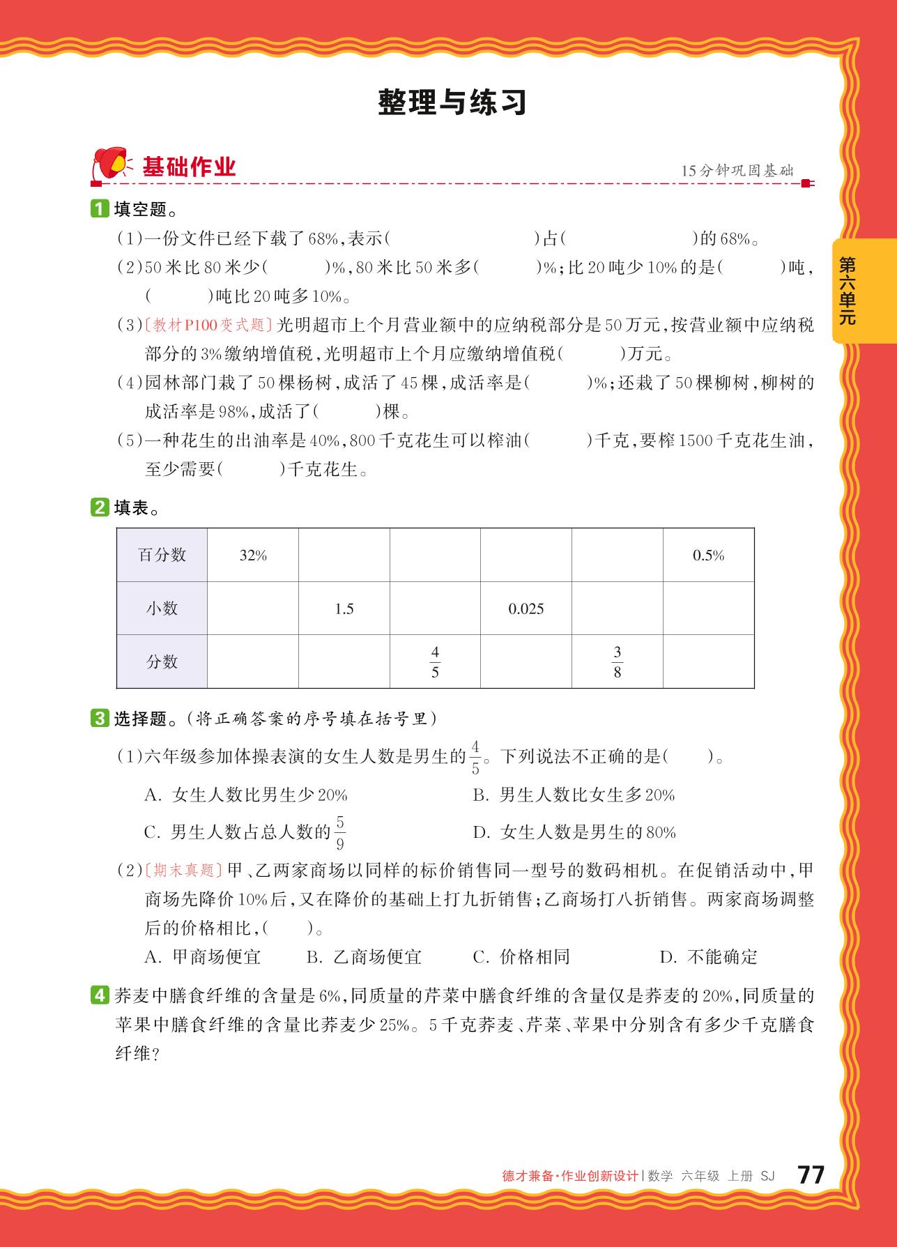 2024秋上册六年级数学苏教版 第六单元 百分数——整理与练习