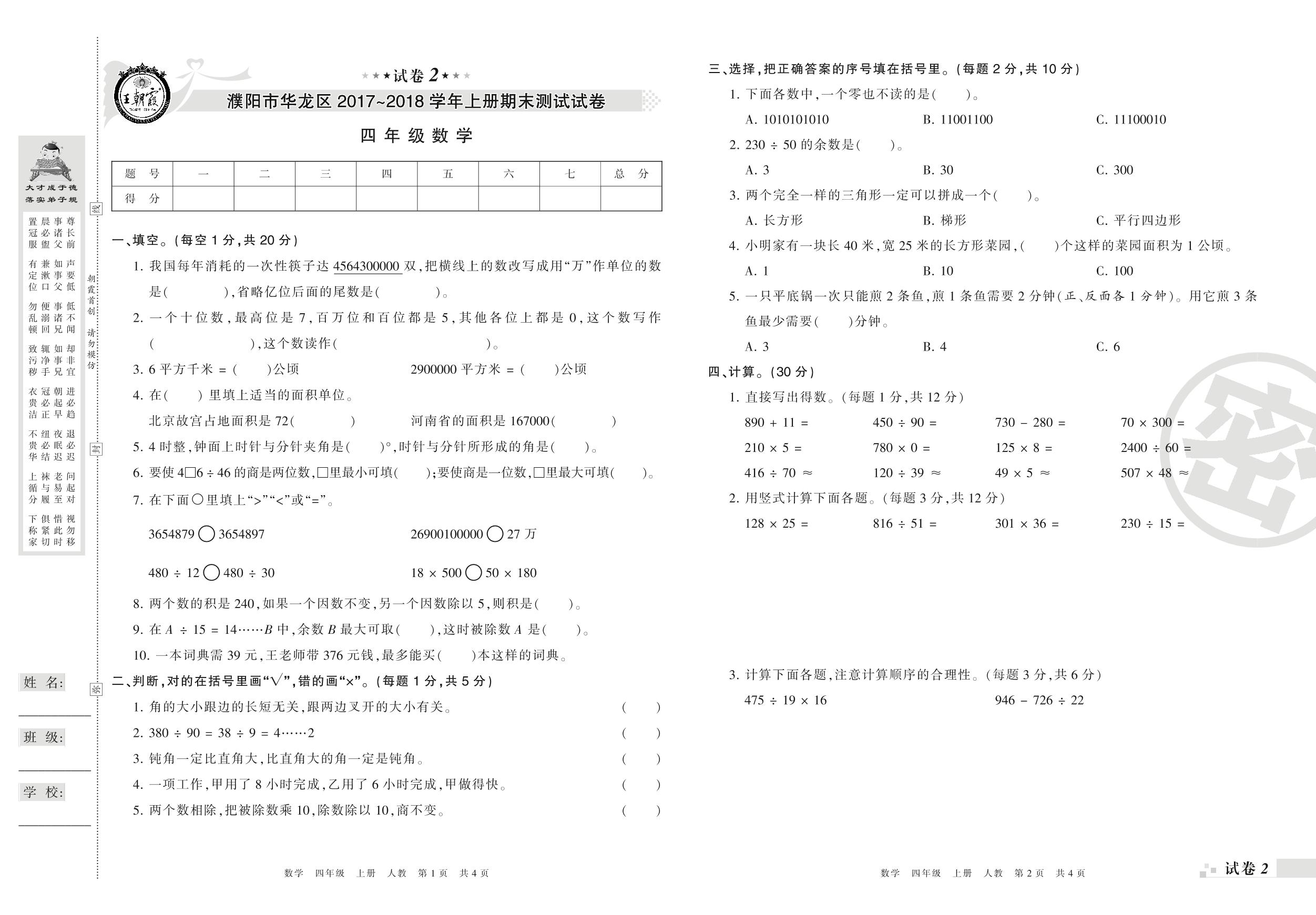 2017-2018学年第一学期濮阳市华龙区四年级数学试卷(人教版)【2】