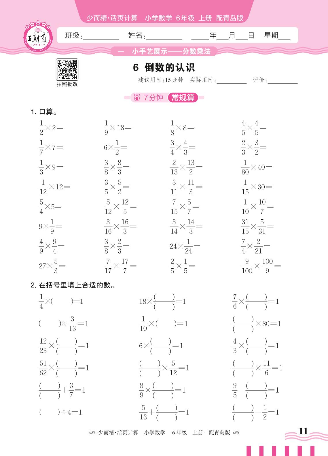 2024秋上册六年级数学青岛版 第一单元 小手艺展示(分数乘法)——6. 倒数的认识