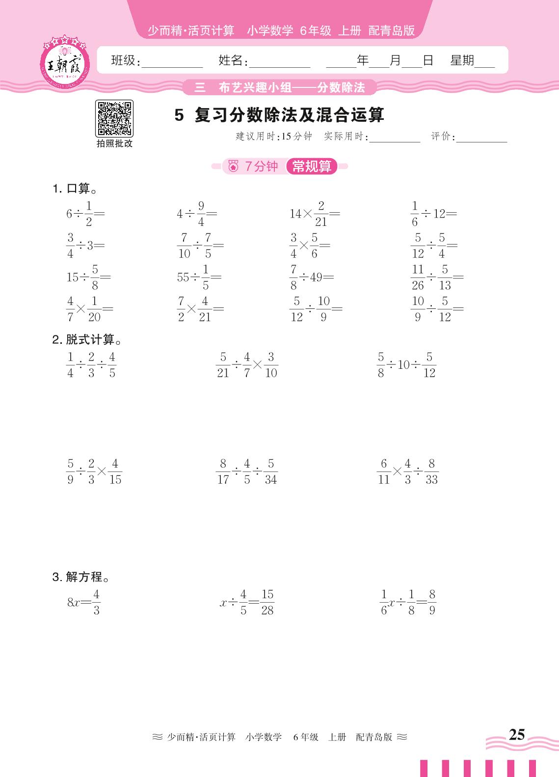 2024秋上册六年级数学青岛版 第三单元 布艺兴趣小组(分数除法)——5. 复习分数除法及混合运算