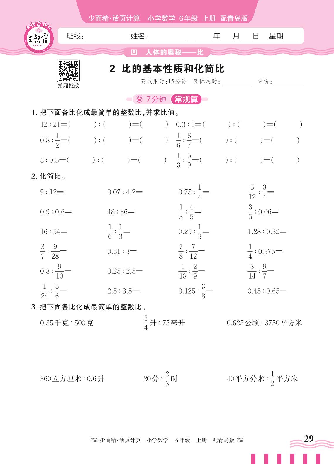 2024秋上册六年级数学青岛版 第四单元 人体的奥秘(比)——2. 比的基本性质和简化