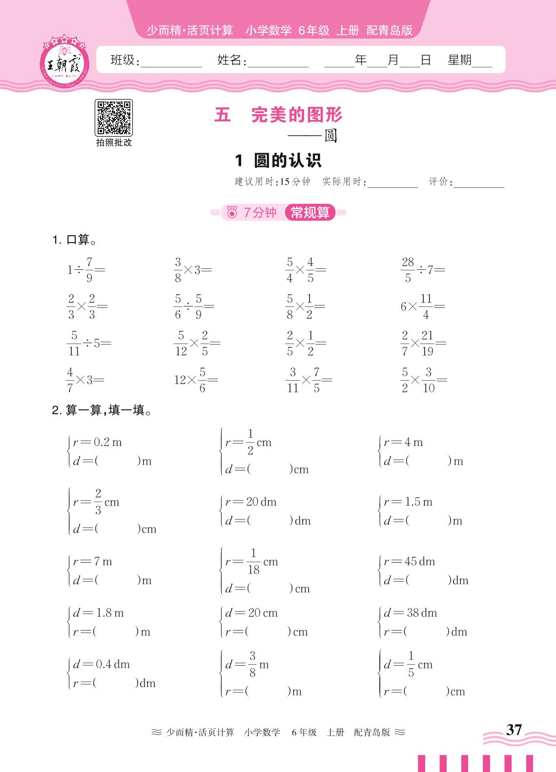 2024秋上册六年级数学青岛版 第五单元 完美的图形(圆)——1. 圆的认识