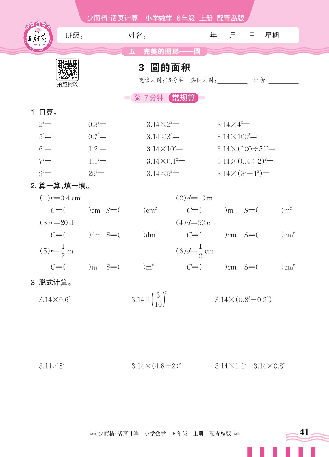 2024秋上册六年级数学青岛版 第五单元 完美的图形(圆)——3. 圆的面积
